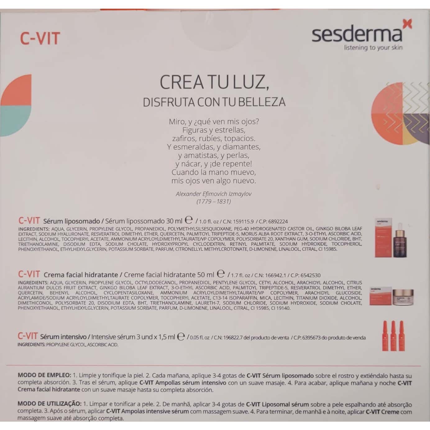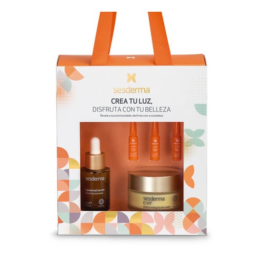 Sesderma Crea Tu Luz Pack C-Vit Crema + Sérum + 3 Ampollas es un conjunto diseñado para iluminar la piel y ayudar a combatir los signos del envejecimiento. Este pack incluye: