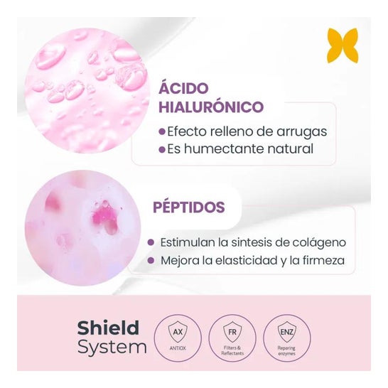 Formulado con filtros solares SPF 50 que protege la piel frente a los rayos UVB/UVA/IR y la luz azul. Además, ayuda a mejorar la firmeza y repara el daño celular. También posee una textura cremosa y de rápida absorción es resistente al agua y no pica en los ojos.