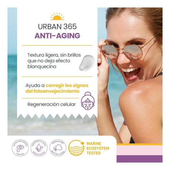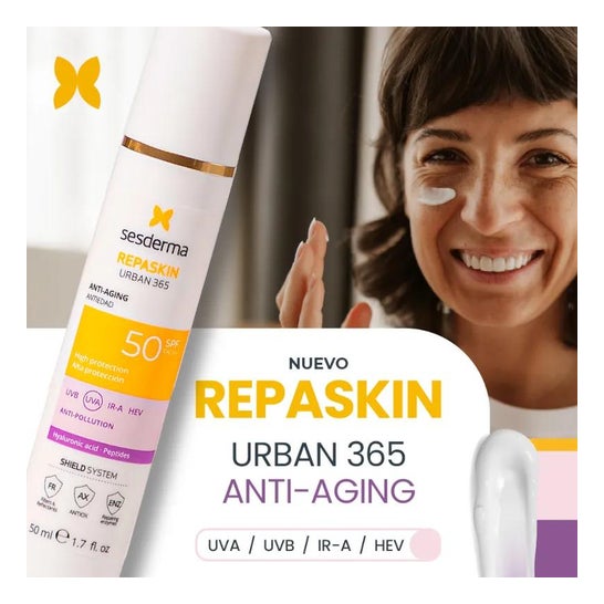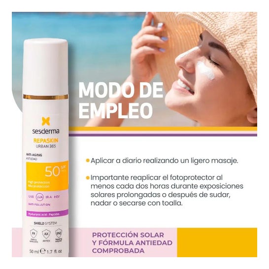 Sesderma Repaskin Urban 365 Antiedad SPF50 50ml es un fotoprotector antiedad de uso diario que ayuda a proteger la piel y prevenir los signos de fotoenvejecimiento como líneas de expresión y/o manchas.