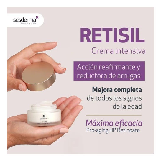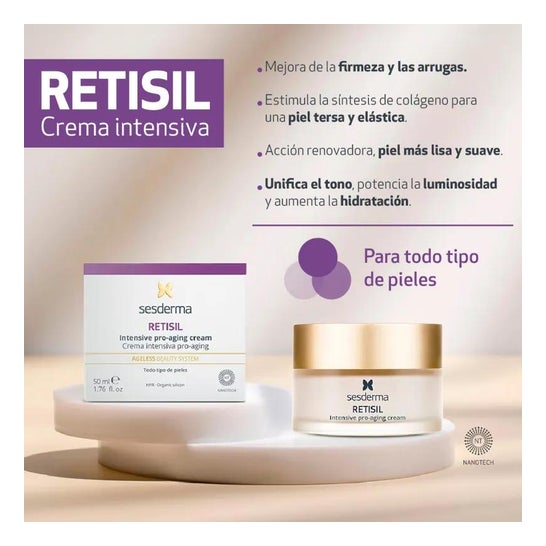 Sesderma Retisil Crema Intensiva Pro-aging 50ml es una crema antiedad global que ayuda a mejorar la firmeza del rostro, atenuando líneas de expresión y combatiendo los signos de envejecimiento.