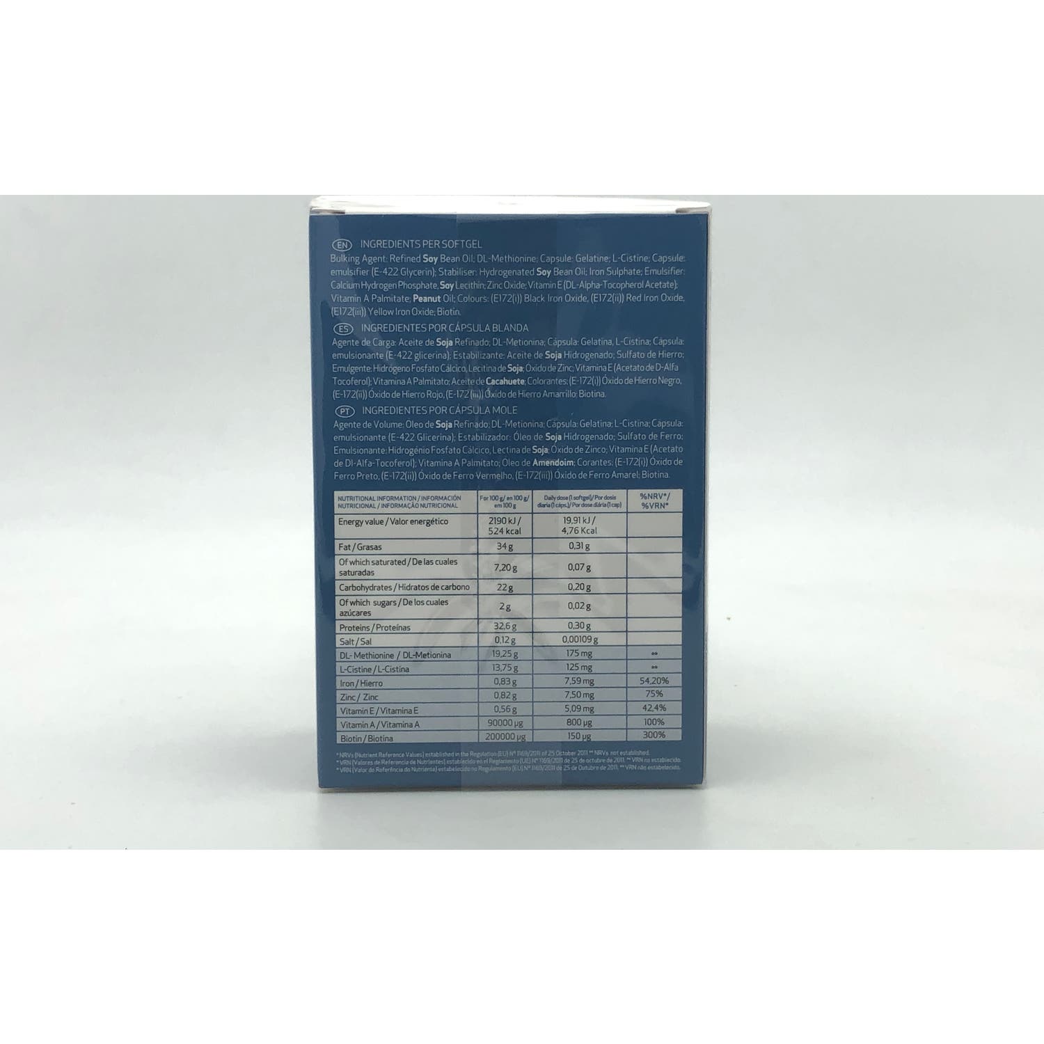 Gracias a su fórmula con Metionina, L-cistina, Zinc, Hierro, Vitamina E, Vitamina A y Biotina, contribuye al mantenimiento del pelo y las uñas en condiciones normales.