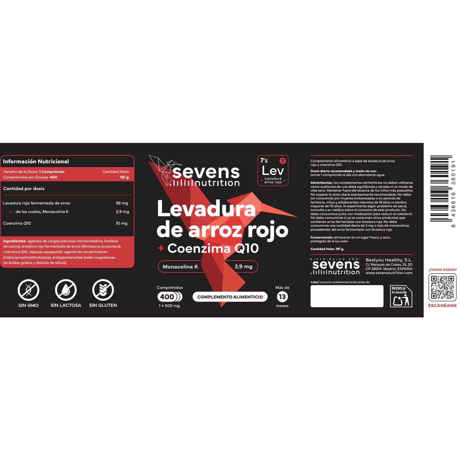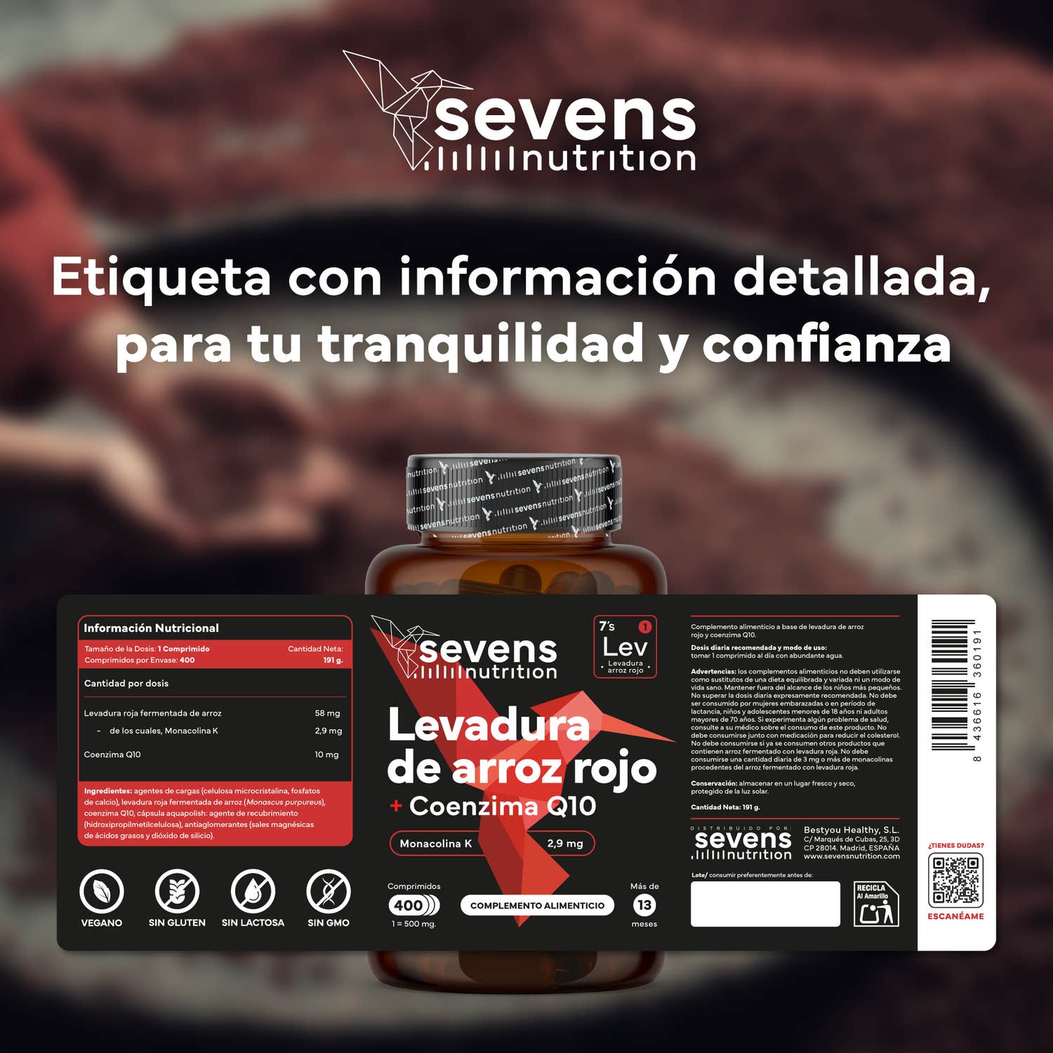 Levadura de Arroz Rojo con Coenzima Q10 de Sevens Nutrition 400comp es un complemento alimenticio en comprimidos, con Monacolina K de origen natural y Coenzima Q10.