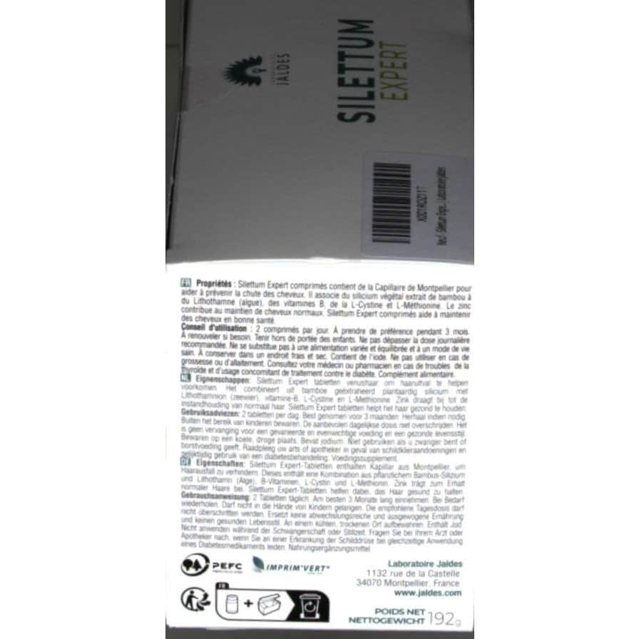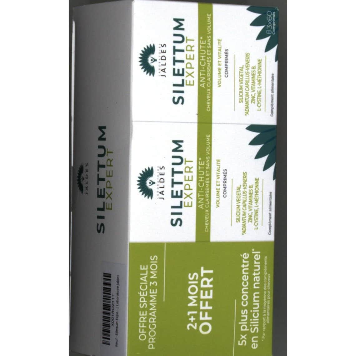 Jaldes Silettum Volumen y Vitalidad Capilar 3x60comp es un complemento alimenticio enriquecido con silicio marino procedente de algas, aminoácidos azufrados y vitaminas del grupo B para aportar volumen y vitalidad al cabello fino. Las dos algas Lithothamnium calcareum y Palmaria palmata contienen minerales y oligoelementos como el calcio, el magnesio y el zinc que remineralizan y fortalecen el cabello. Los aminoácidos L-metionina y cisteína forman parte de la composición de la queratina, la principal proteína del cabello, y refuerzan la fibra capilar. Las vitaminas del grupo B (B8, B6, B9) favorecen un crecimiento sano.Adecuado para adultos y adolescentes.Fabricado en Francia.3 por caja.Este complemento alimenticio no sustituye a una dieta variada y equilibrada ni a un estilo de vida saludable.