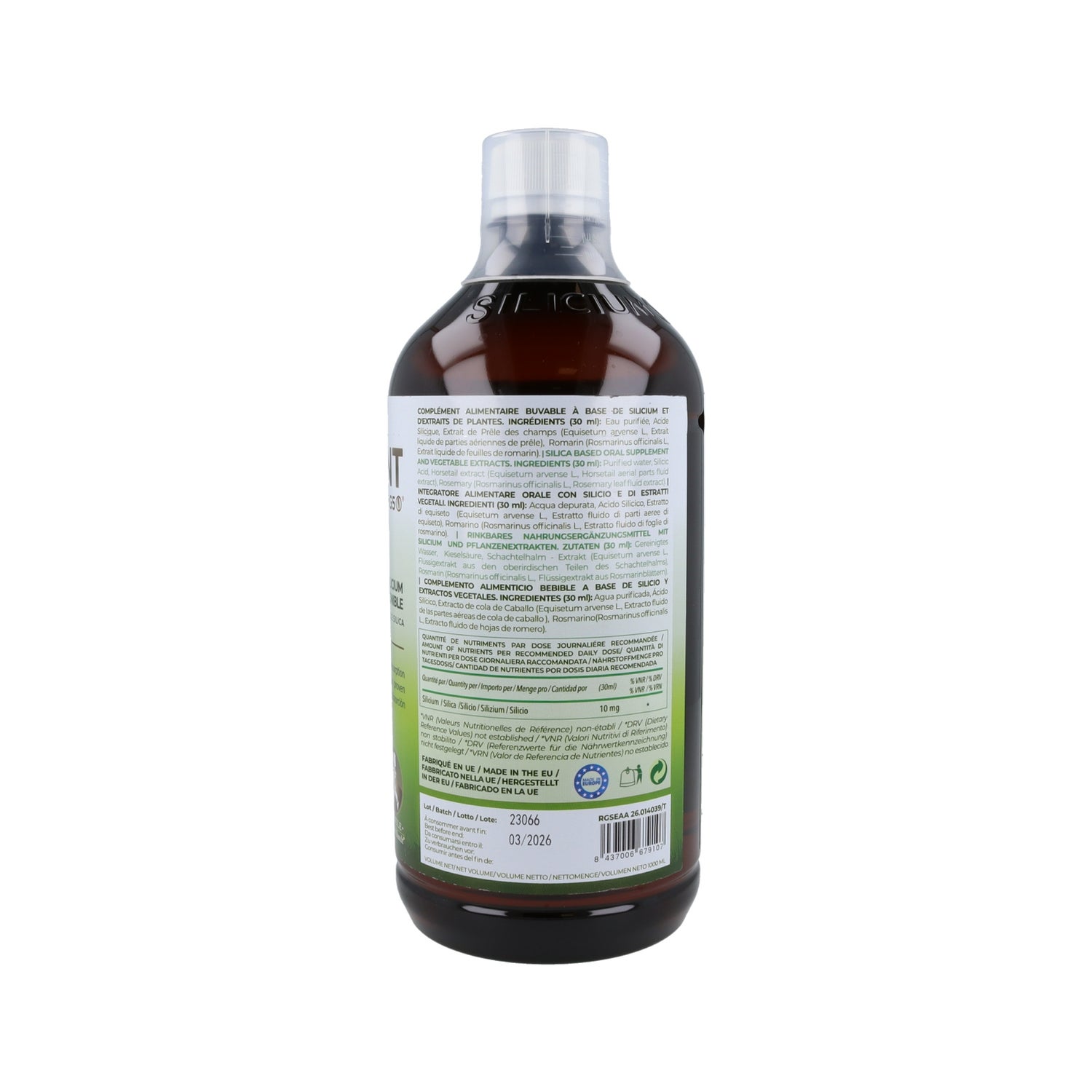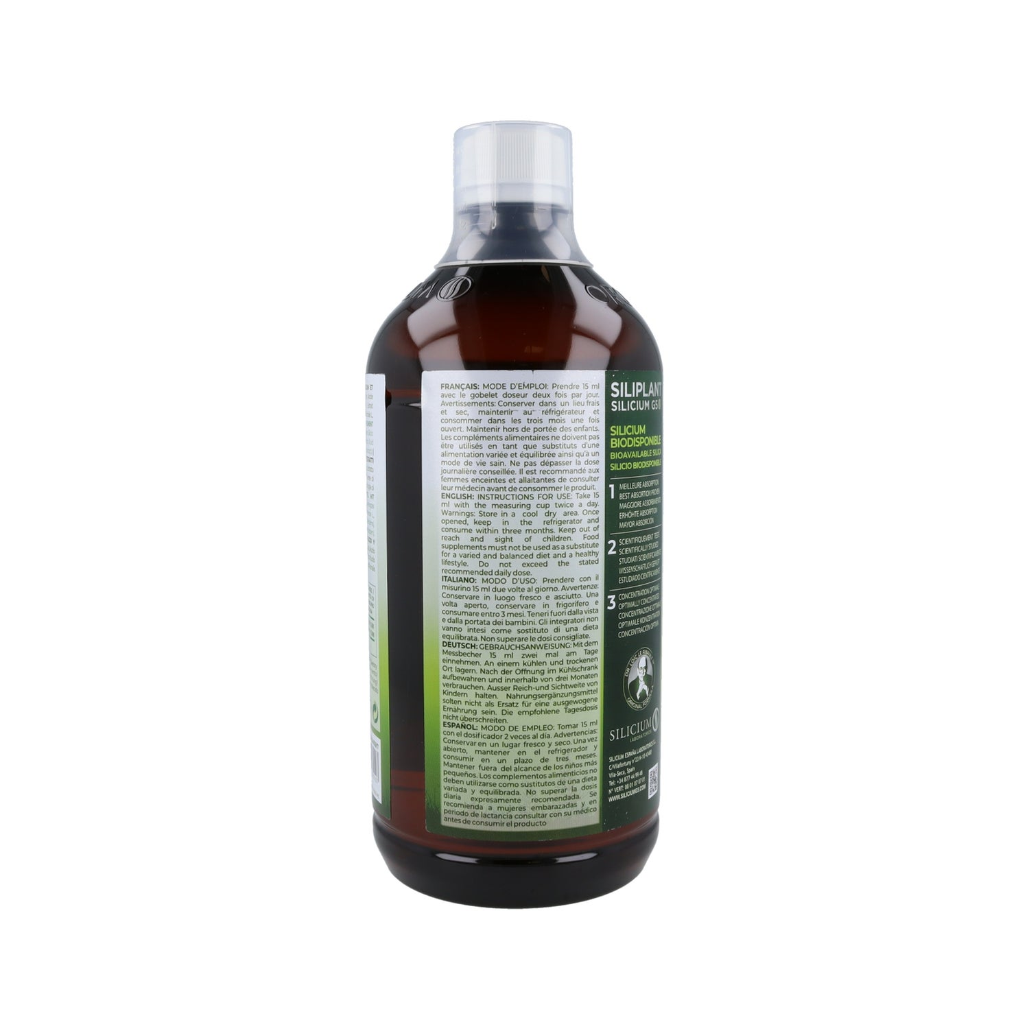 Silicium G5 Siliplant 1L es un complemento alimenticio que ayuda a promover el bienestar de los huesos y las articulaciones, fortalece el cuerpo. Es un silicio orgánico, de origen vegetal, altamente asimilable por el organismo. También es un oligoelemento esencial para muchos procesos bioquímicos a nivel celular. Su función en el colágeno, elastina y tejido conjuntivo ha sido científicamente probada.