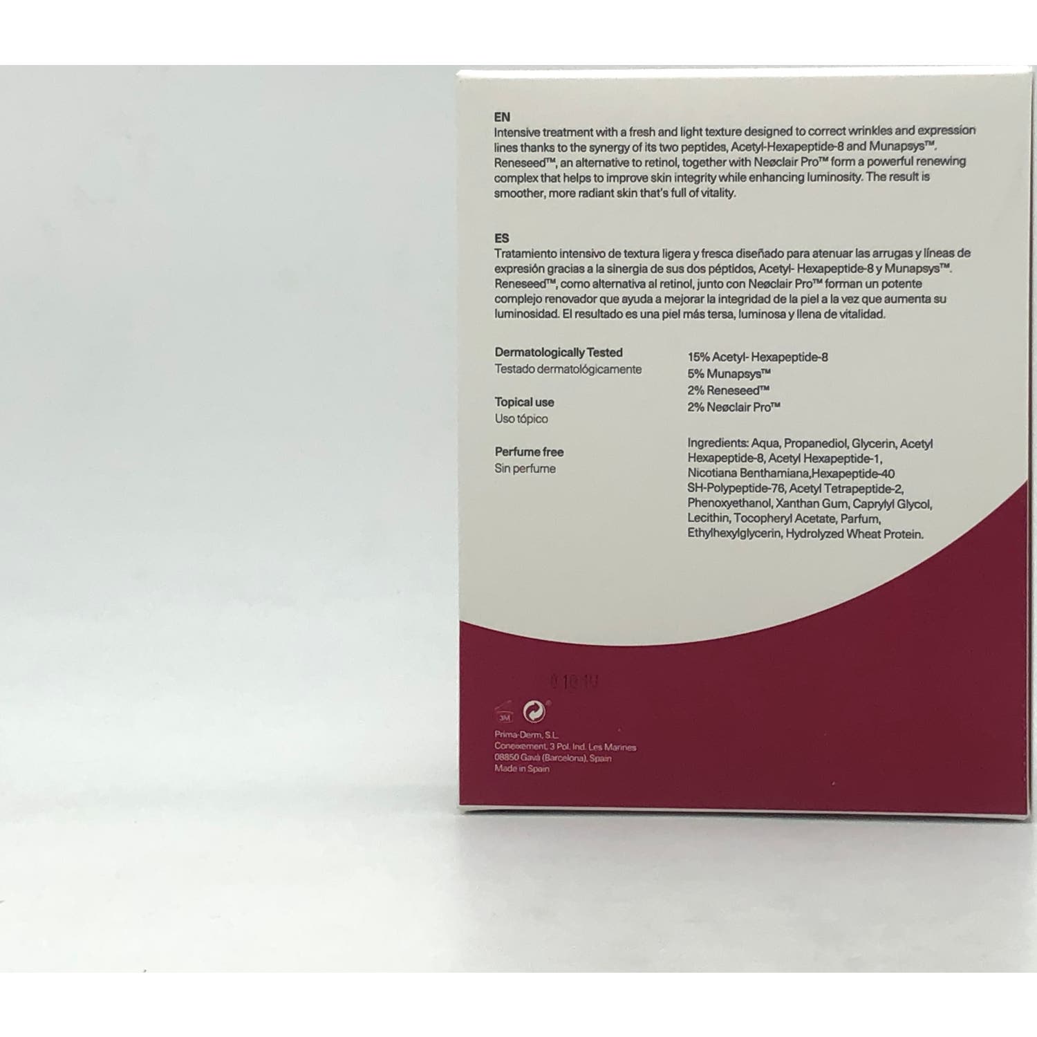 Sérum concentrado diseñado para hidratar la piel del rostro en profundidad. Contribuye a proteger la piel de la polución y favorece la prevención de la piel seca. Ayuda a reparar el daño celular y disminuir la apariencia de las manchas de la piel. Elaborado a base de péptidos con efecto bótox y péptidos biomiméticos antioxidantes. Recomendado para calmar la epidermis, deja la piel suave. Adecuado para todo tipo de pieles.