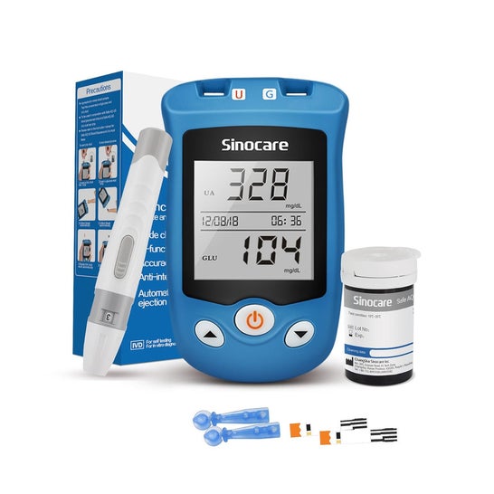 Sinocare Kit Glucómetro 2 en 1 Glucosa Ácido Úrico + 25 Tiras es un dispositivo diseñado para facilitar la monitorización de los niveles de glucosa y ácido úrico en sangre. Su diseño ergonómico garantiza una experiencia cómoda y sin dolor, contando con nueve configuraciones de profundidad que minimizan la incomodidad durante el proceso de obtención de muestras.