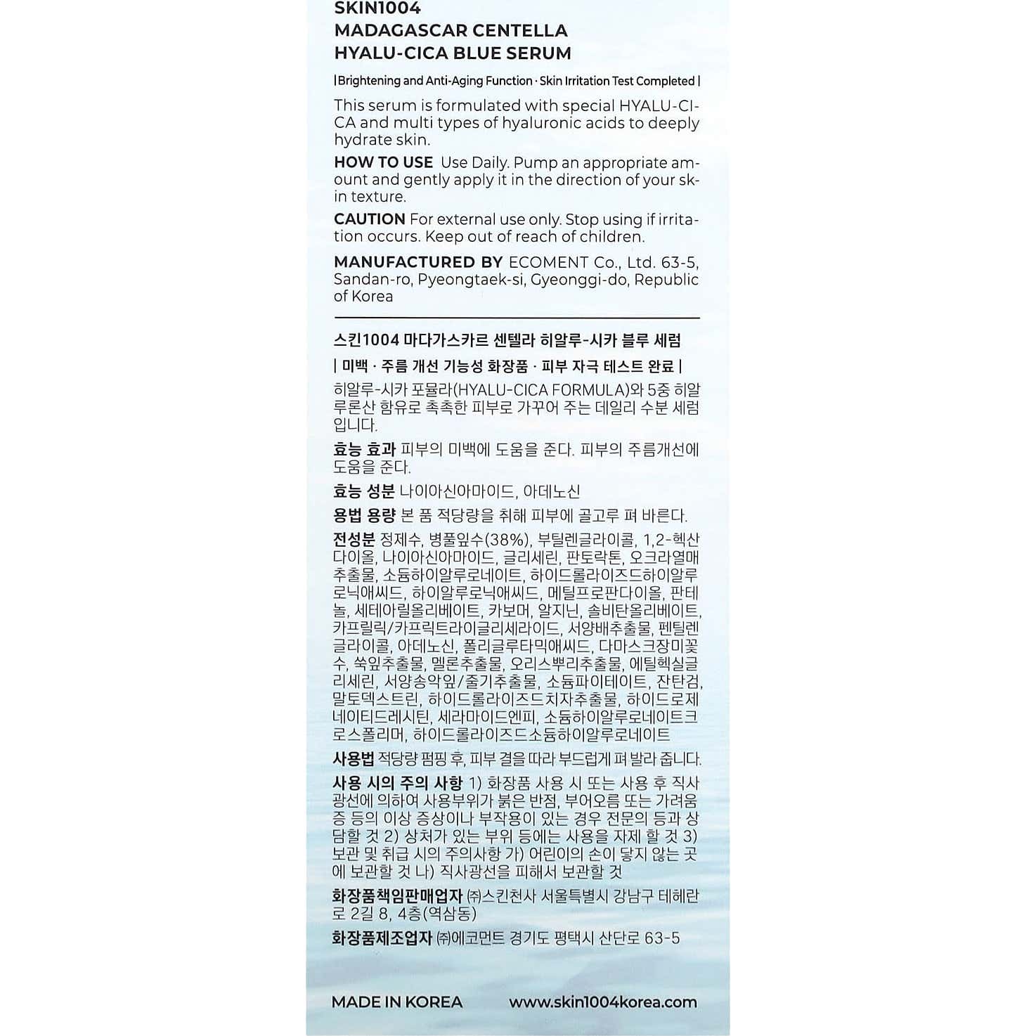 Skin1004 Madagascar Centella Hyalu-Cica Blue Serum 50ml es un sérum facial formulado con ácido hialurónico y centella asiática de Madagascar, diseñado específicamente para hidratar y suavizar la piel sensible. Su composición avanzada incluye: