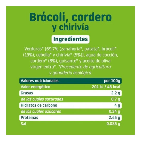 Verduras [51% (zanahoria, patata, brocoli(9%), cebolla, guisante, chirivía(3%)], agua de cocción, cordero(8%),aceite de oliva virgen extra(1.5%).