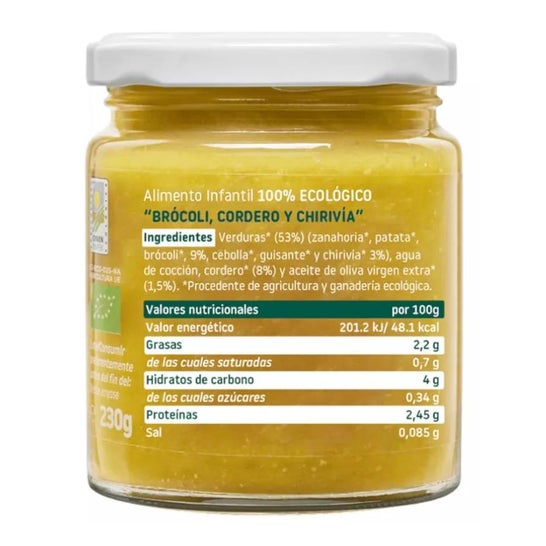 Puré salado indicado para una saludable alimentación de los bebés a partir de los 8 meses, está formulado con ingredientes naturales. En esta oportunidad su base es de brócoli, cordero y chirivía, no cuenta con azúcares ni sales añadidos, sin conservantes. Cuenta con propiedades nutricionales como vitaminas, calcio, magnesio, potasio, proteínas, fibra, hierro, entre otros elementos que generan grandes beneficios, entre ellos el estimular el desarrollo adecuado del bebé, fortalecer el sistema inmunitario, ayudar a hacer la digestión y contribuir en mantener una dieta equilibrada.