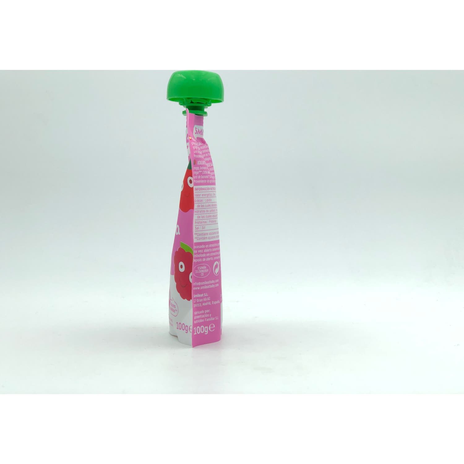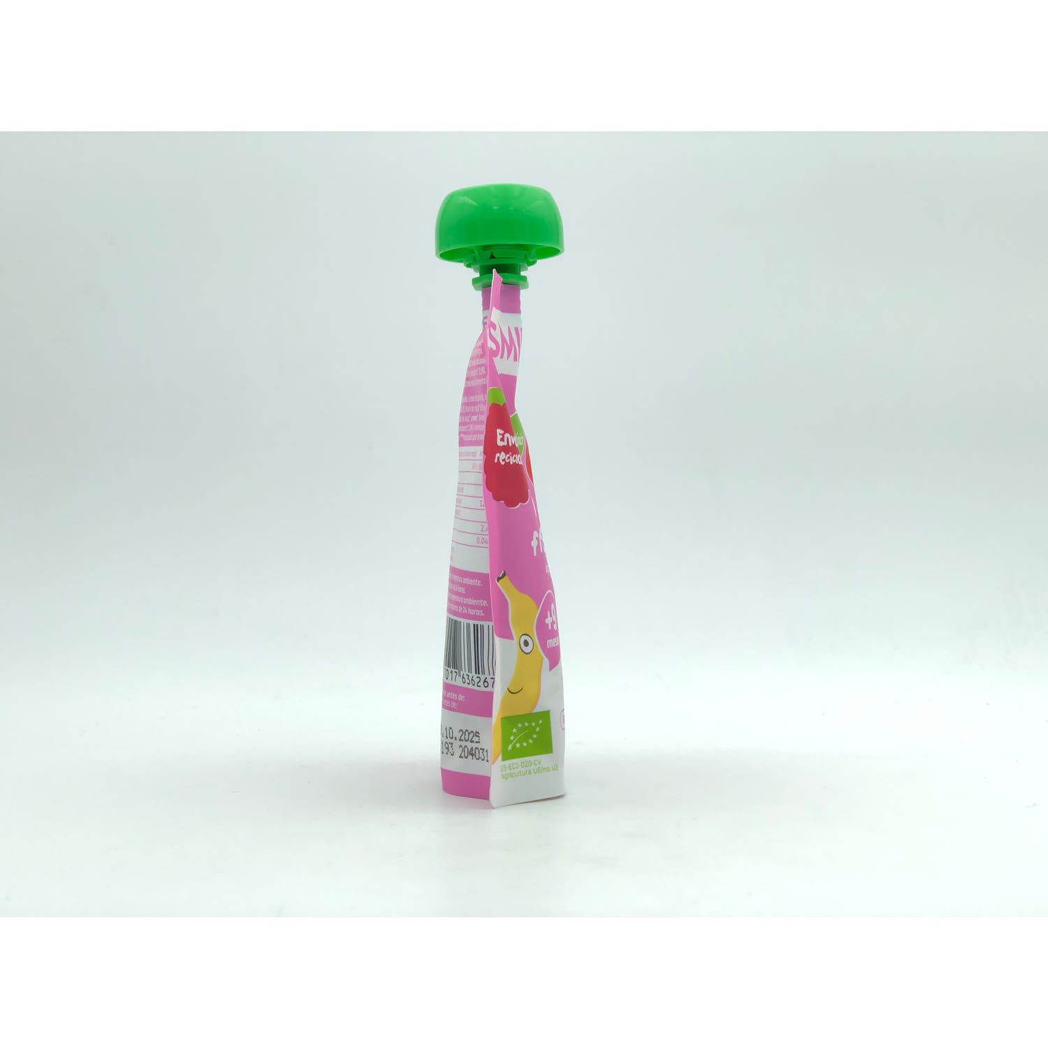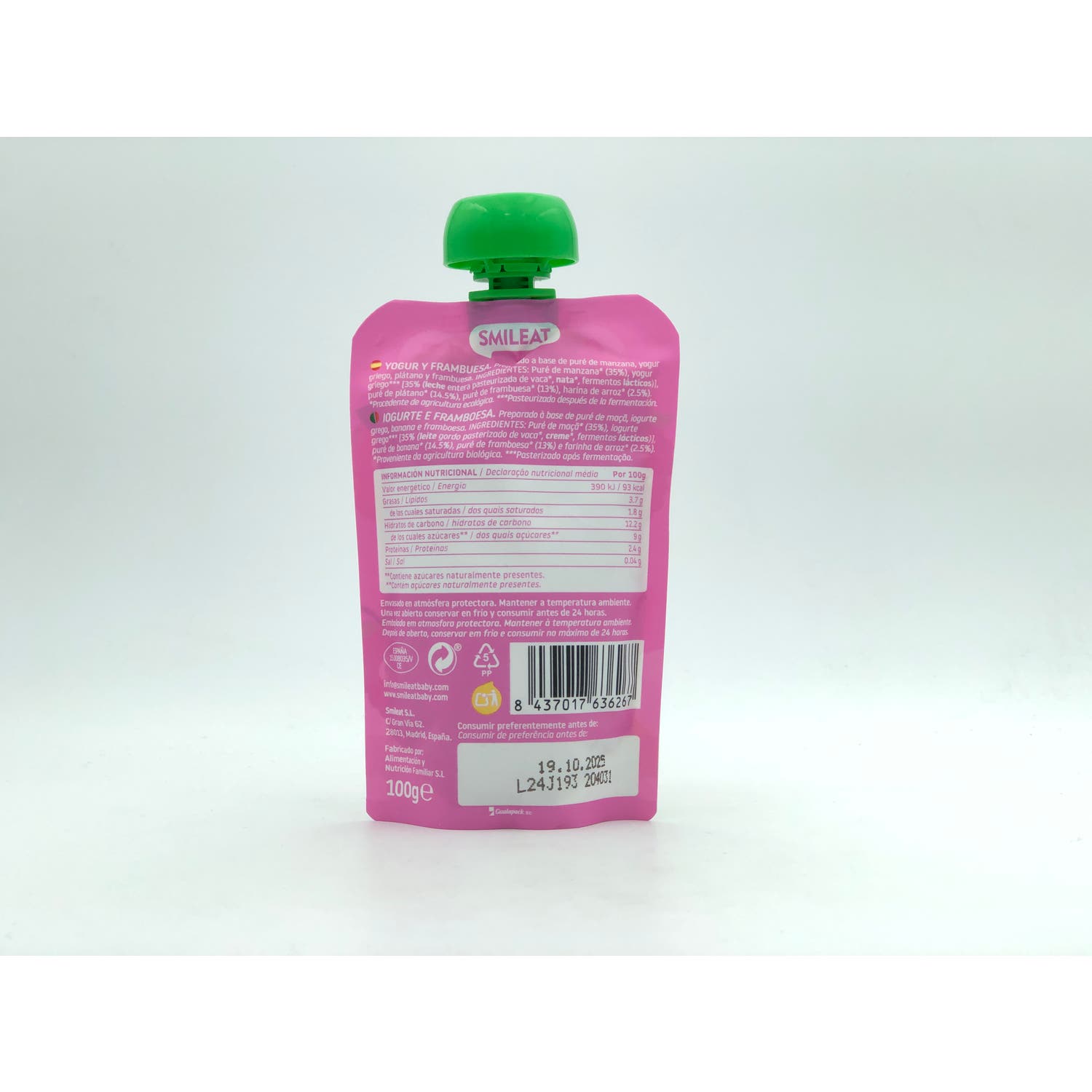 Envase bebible compuesto por yogur, frambuesa y manzana perfecto para desayunos, meriendas o snacks de niños a partir de 12 meses. Su textura suave y fácil de ingerir favorece el desarrollo alimenticio de los más pequeños ya que no contiene gluten, huevo, aditivos, ni azúcares añadidos. Además el envase de origen vegetal es respetuoso con el medio ambiente.