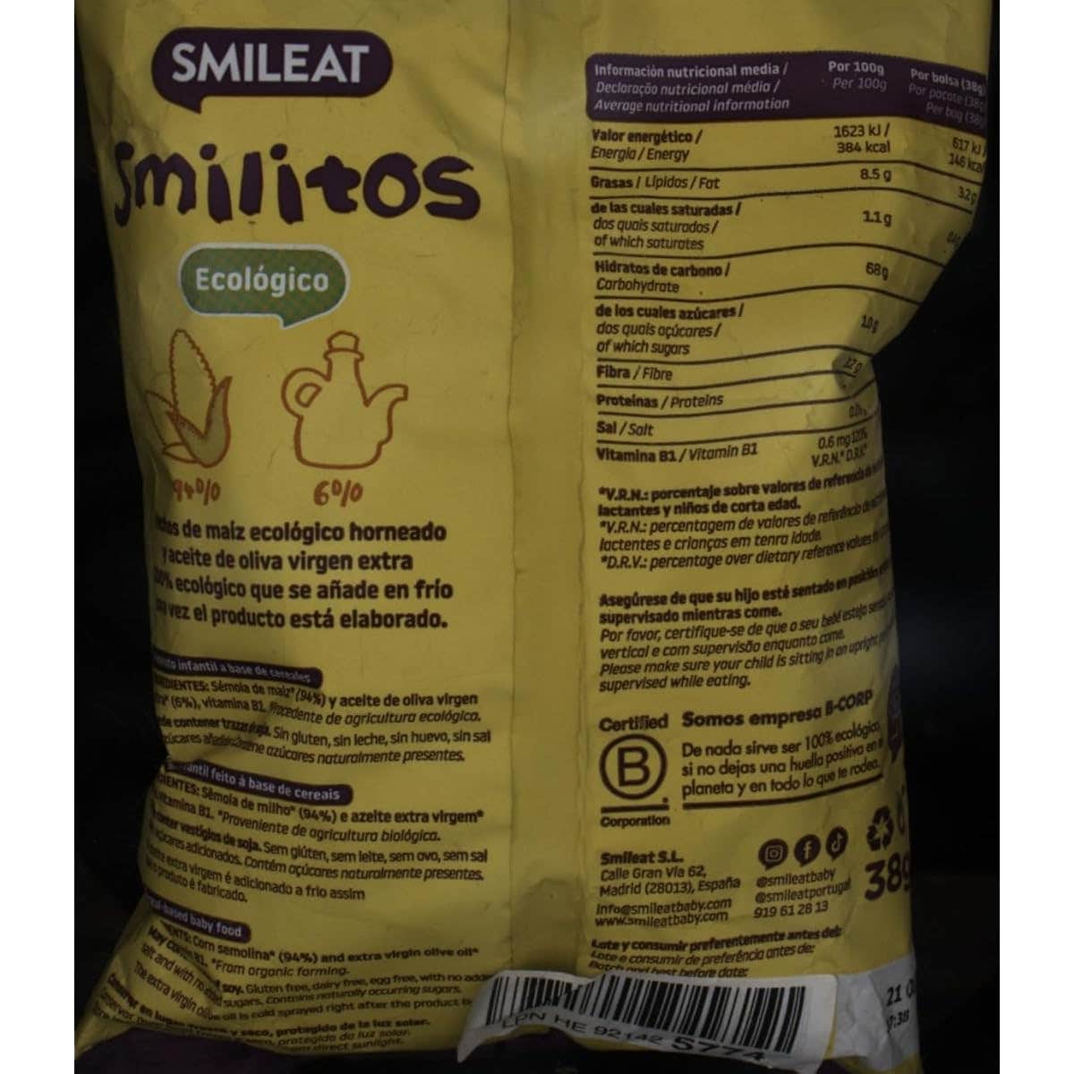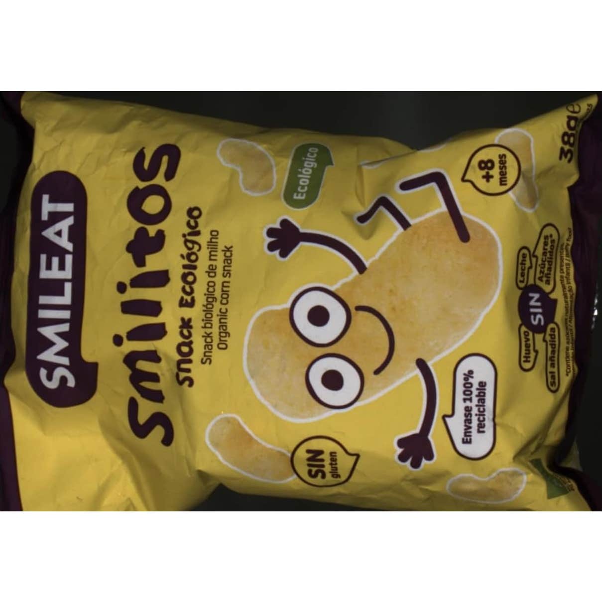 Smileat Smilitos - Gusanitos De Maiz Ecológico es un snack elaborado con maíz ecológico horneado y aceite de oliva virgen extra 100% ecológico, el cual se añade en frío una vez el producto está elaborado.
