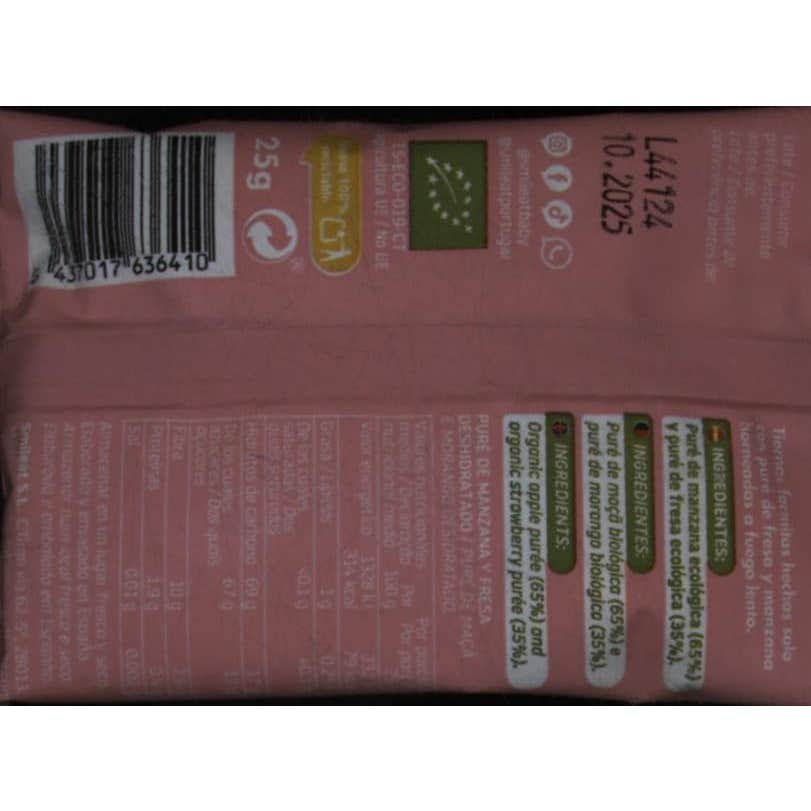 Snack para niños a base de fresas y manzanas con una textura parecida a las gominolas. No contiene azúcar añadida, edulcorantes ni aditivos. Horneado en moldes a fuego lento para preservar los nutrientes de las frutas y darle una forma divertida. Libre de gluten, leche y huevos. Puede ser el complemento ideal para cualquier comida durante el día.