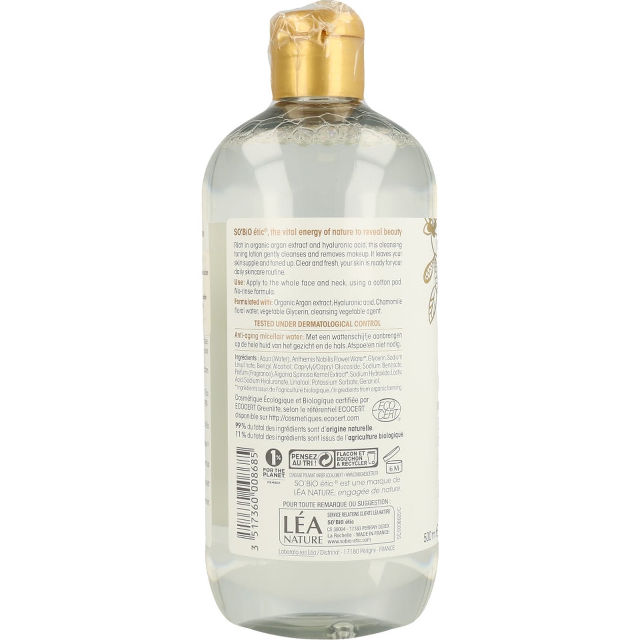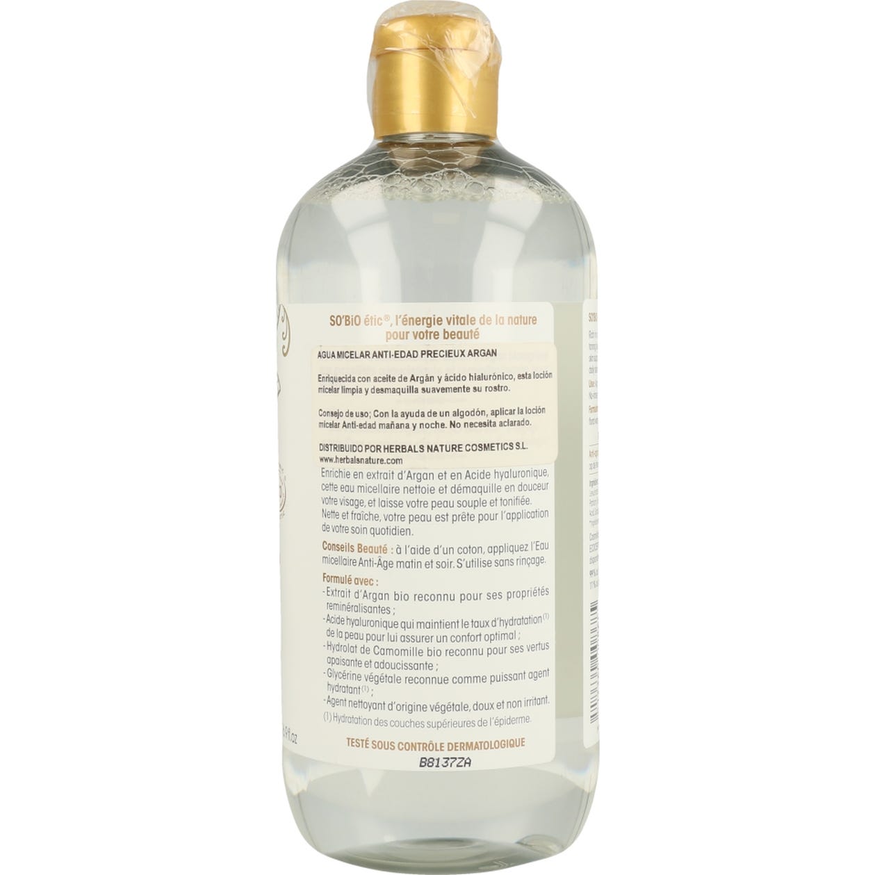 So´Bio Étic agua micelar Précieux argán es una rica solución líquida indicada para limpiar y sanear la piel de la manera más delicada posible. Contiene ingredientes BIO (extracto de argán) para suavizar la piel, y ácido hialurónico para hidratarla desde las capas más profundas. Beneficios: