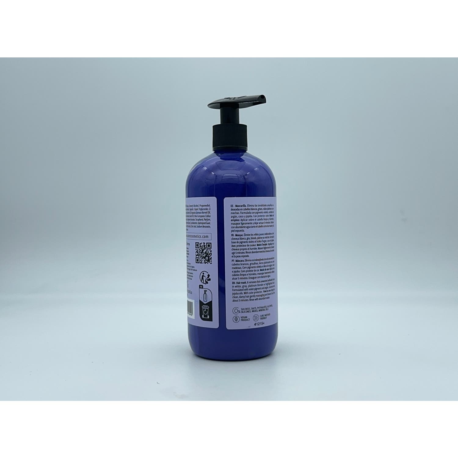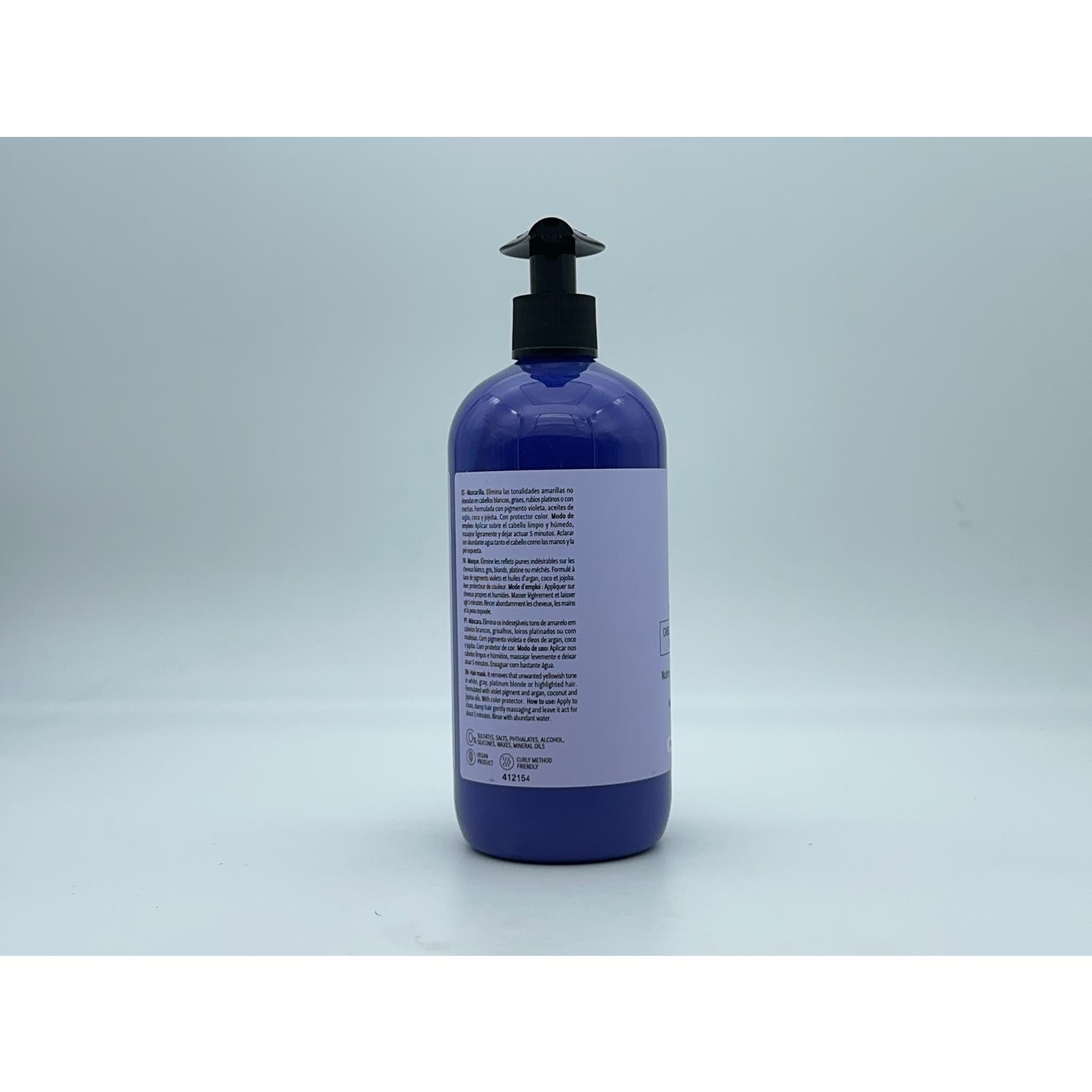 Mascarilla para pelo. Indicada en personas con cabellos blancos, grises o con mechas rubias que están desgastadas o no son deseados. Matiza y oscurece, gracias al principal componente, pigmento de violeta. Contiene aceite de argán, coco y jojoba que nutren, reparan y aportan una apariencia más viva y joven. No incluye sulfatos, ftalatos, sales ni alcoholes.