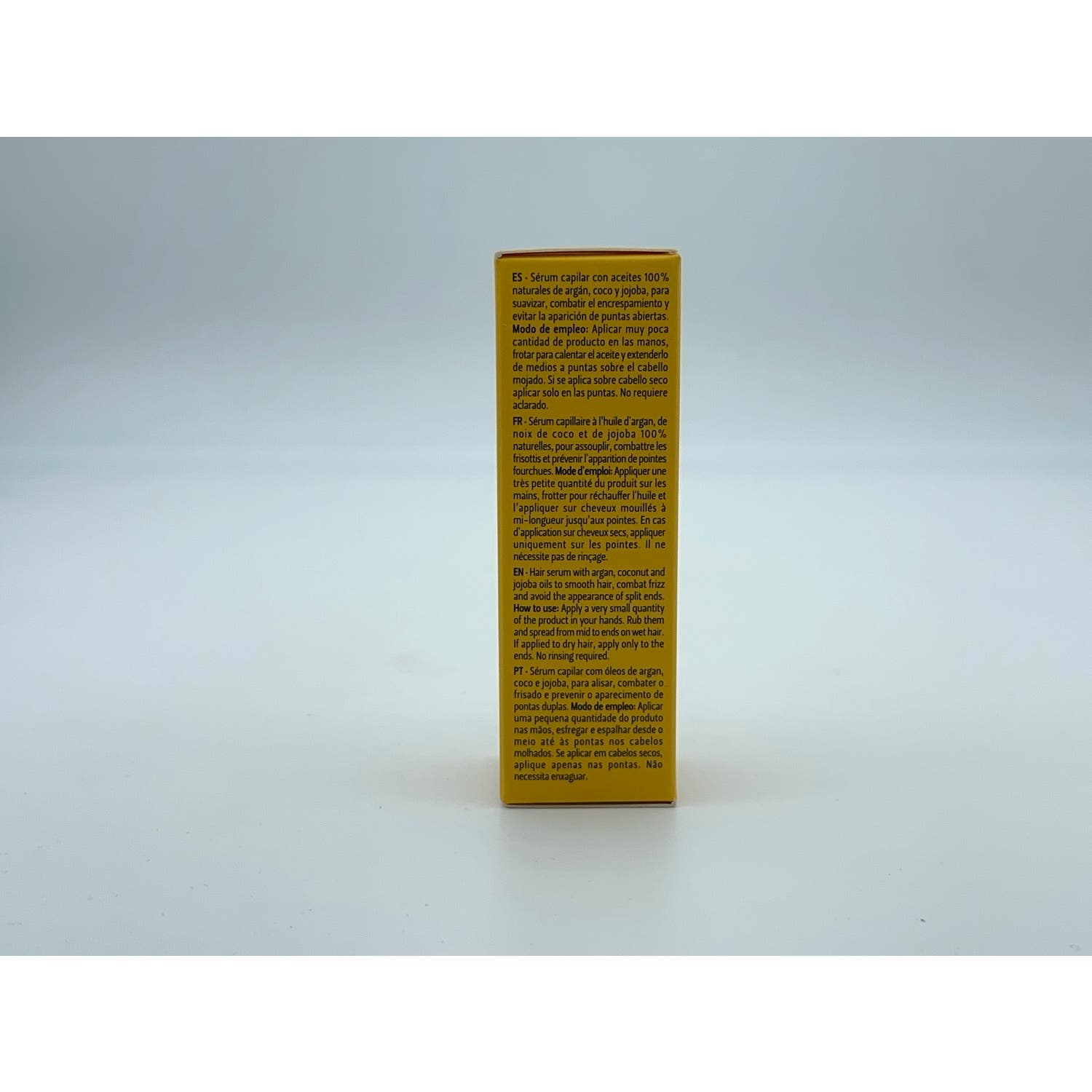 Sérum para la salud capilar. Formulado a partir de aceites 100% naturales de argán, coco y jojoba. Reparan, reconstruyen, nutren y dan vida a cabellos castigados o envejecidos. La aplicación diaria evita el encrespamiento, dando suavidad extra. Impide que las puntas queden abiertas. No contiene sulfatos, ftalatos, sales, alcoholes, siliconas, aceites minerales ni ceras.