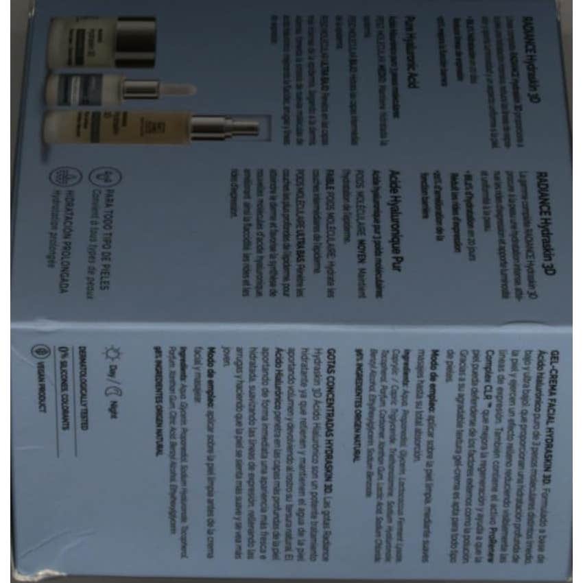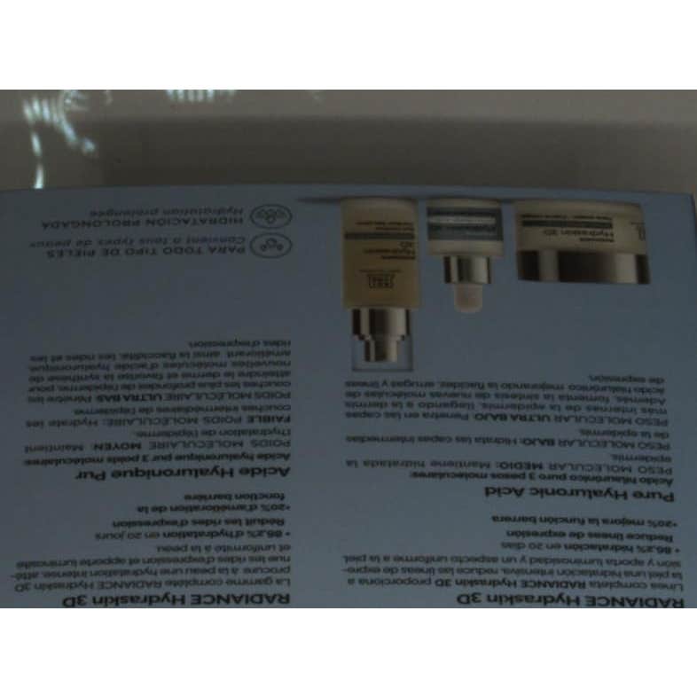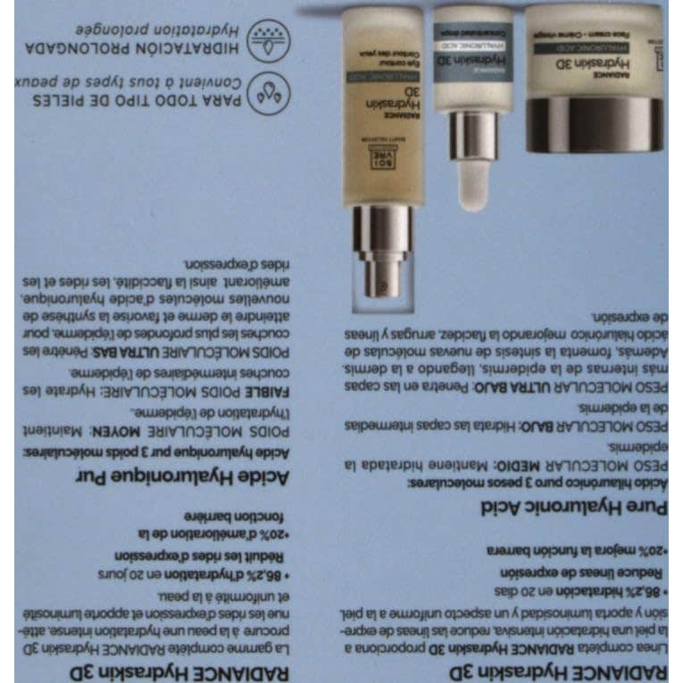 La crema Radiance Hydraskin 3D está elaborada con ácido hialurónico puro que cuenta con tres pesos moleculares diferentes, permitiendo: