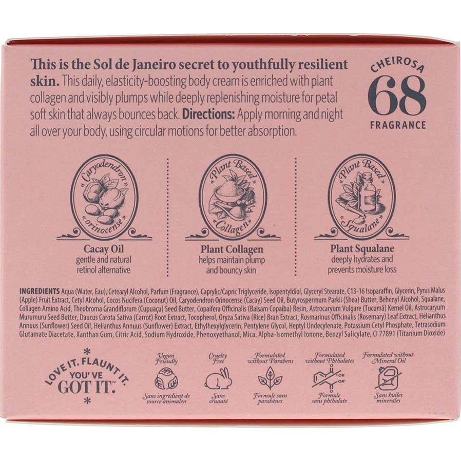 Sol de Janeiro Beija Flor Elasti Cream es una crema corporal diseñada para proporcionar un cuidado integral a la piel, similar al que se ofrece al rostro. Este producto se centra en lograr una piel radiante y tersa, gracias a su formulación nutritiva y elástica que ha sido clínicamente probada para estimular la producción de colágeno, un elemento fundamental para mantener la firmeza y revitalización de la piel.
