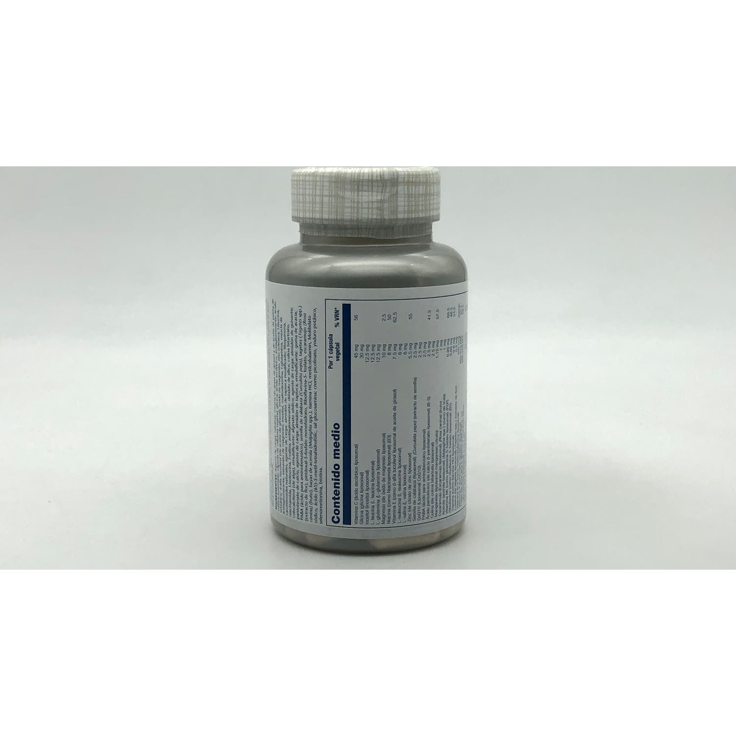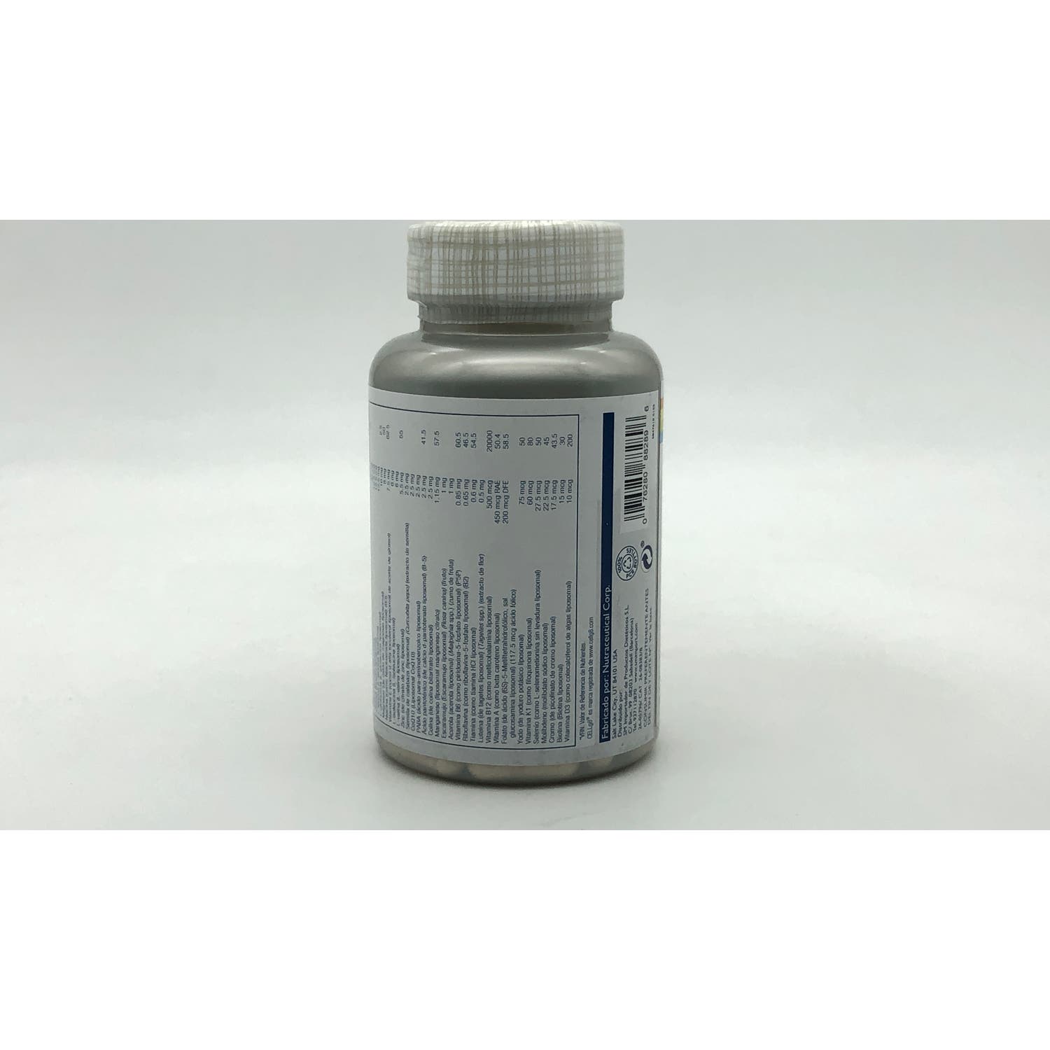 Agente de carga: celulosa; mezcla de grasa de girasol y de aceite de palma de cultivo sostenible; cápsula de celulosa vegetal; glicina, ácido ascórbico, antiaglomerante: ácido esteárico; d-alfa tocoferol (de aceite de girasol), óxido de magnesio, zinc (citrato), l-leucina, antiaglomerante: estearato de magnesio; inositol, maltodextrina, l-glutamina, mezcla de carotenoides naturales, agente de carga: almidón de tapioca modificado; filoquinona, niacinamida, l-isoleucina, l-valina, antiaglomerante: dióxido de sílice; colina bitartrato, colecalciferol (de alga), emulsificante: alginato sódico; agente de carga: almidón de guisante; pantotenato de calcio, agente de carga: almidón de tapioca; emulsificante: goma de acacia; PABA (ácido para aminobenzoico), semilla de calabaza (Curcubita pepo), tagetes (Tagetes spp.) (extracto de flor), piridoxal 5 fosfato monohidrato, Riboflavina-5- fosfato, escaramujo (Rosa canina) (fruto), bayas de acerola (Malpighia spp.), tiamina HCl, methylcobalamin, Molibdato sódico, ácido (6S)-5-metil- tetrahidrofólico, sal glucosamina; cromo picolinato, yoduro potásico, selenometionina, biotina.