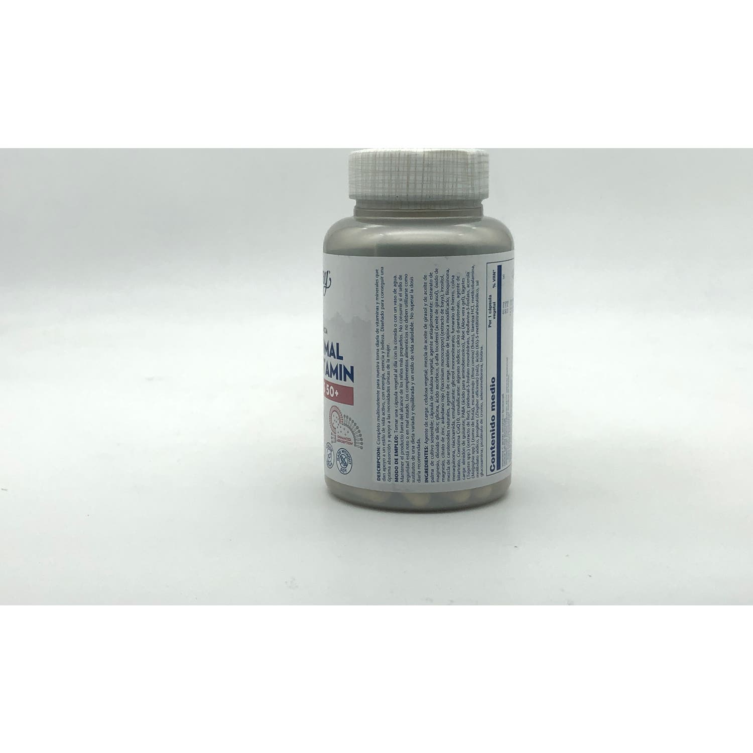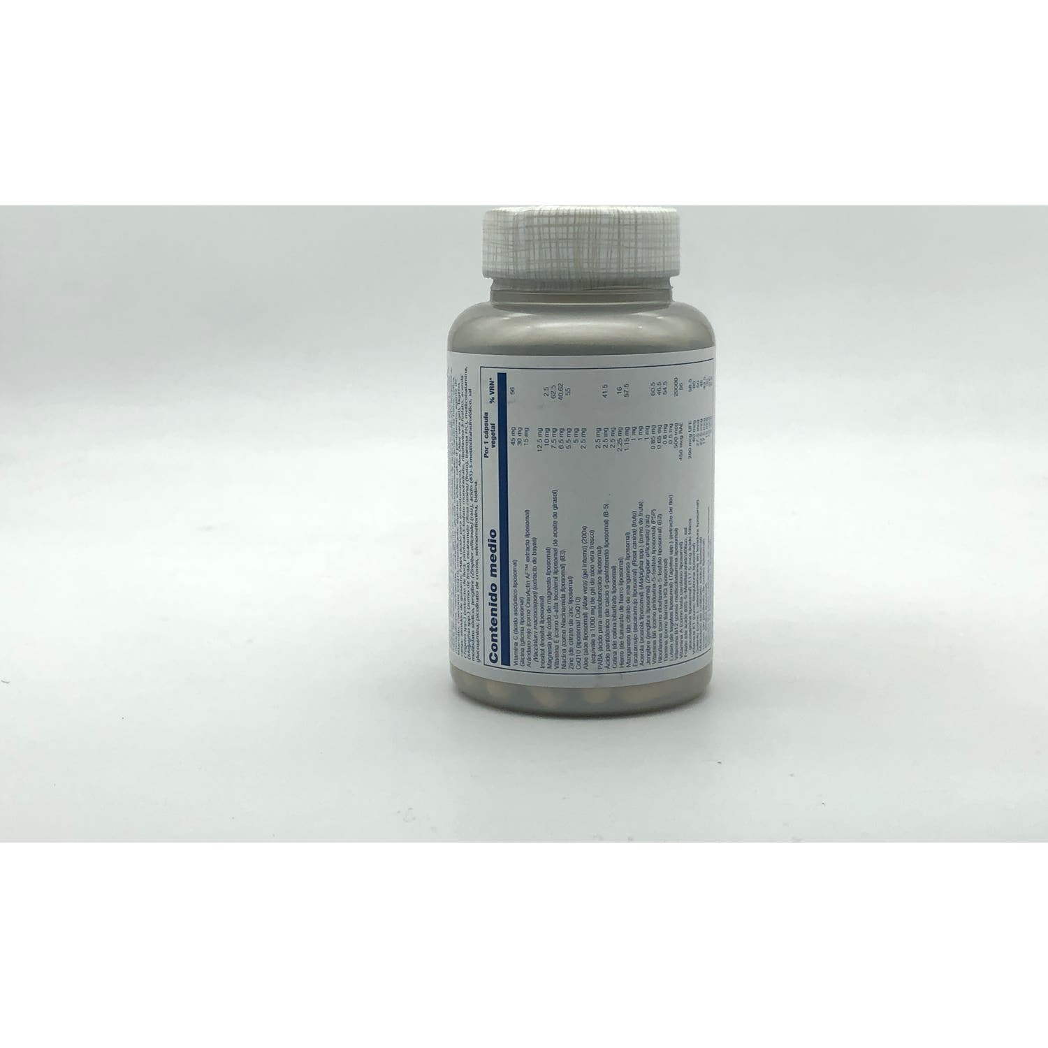 Agente de carga: celulosa vegetal; mezcla de aceite de girasol y de aceite de palma de cultivo sostenible; cápsula de celulosa vegetal; antiaglomerante: estearato de magnesio, dióxido de sílice; glicina, ácido ascórbico, d-alfa tocoferol (aceite de girasol), óxido de magnesio, citrato de zinc, arándano rojo (Vaccinium macrocarpon) (extracto de baya), inositol, mezcla de carotenoides naturales, agente de carga: endurecimiento de tapioca modificado ; filoquinona, menaquinona, niacinamida, emulsificante: glicerol monoestearato; fumarato de hierro, colina bitartrato, Coenzima CoQ10, emulsificante: alginato sódico; calcio d-pantotenato, agente de carga: almidón de guisante;PABA (ácido para aminobenzoico), Aloe (gel de aloe vera), tagetes (Tagetes spp.) (extracto de flor); piridoxal-5-fosfato monohidrato, riboflavina-5-fosfato, acerola (Malpighia spp. ) (zumo de fruta), escaramujo (Rosa canina) (fruto) tiamina HCl, metilcobalamina, molibdato sódico, Jengibre (Zingiber officinale) (raíz), ácido (6S)-5-metil tetrahidrofólico, sal glucosamina; picolinato de cromo, selenometionina, biotina.