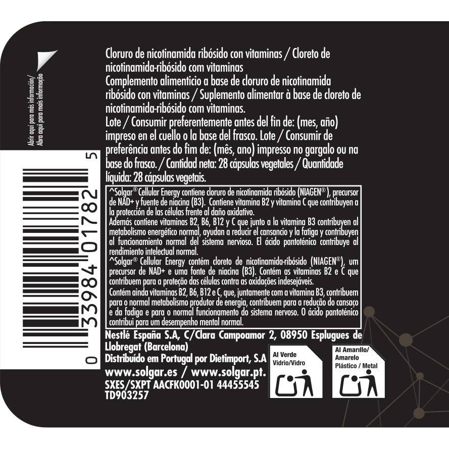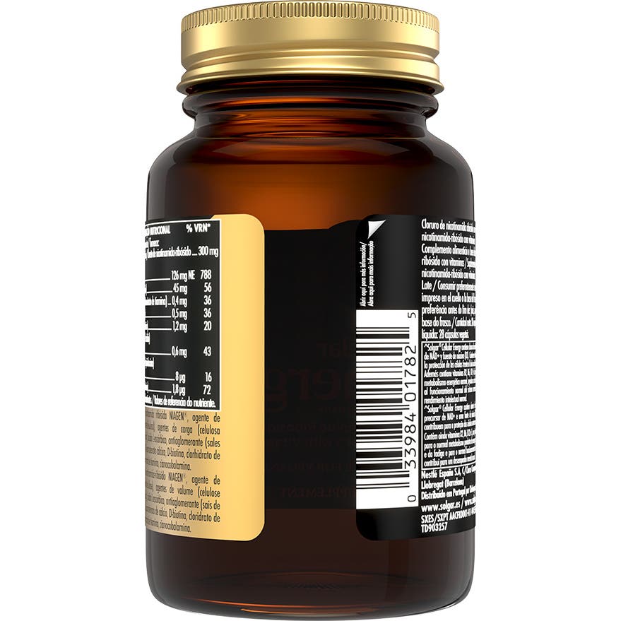 Solgar Cellular Energy contiene cloruro de nicotina ribósido (NIAGEN®), precursor de NAD+ y fuente de niacina (vitamina B3), un nutriente esencial que nuestras células necesitan para producir energía y mantener el metabolismo activo. También contiene la vitamina B12 para apoyar los procesos naturales de división celular.