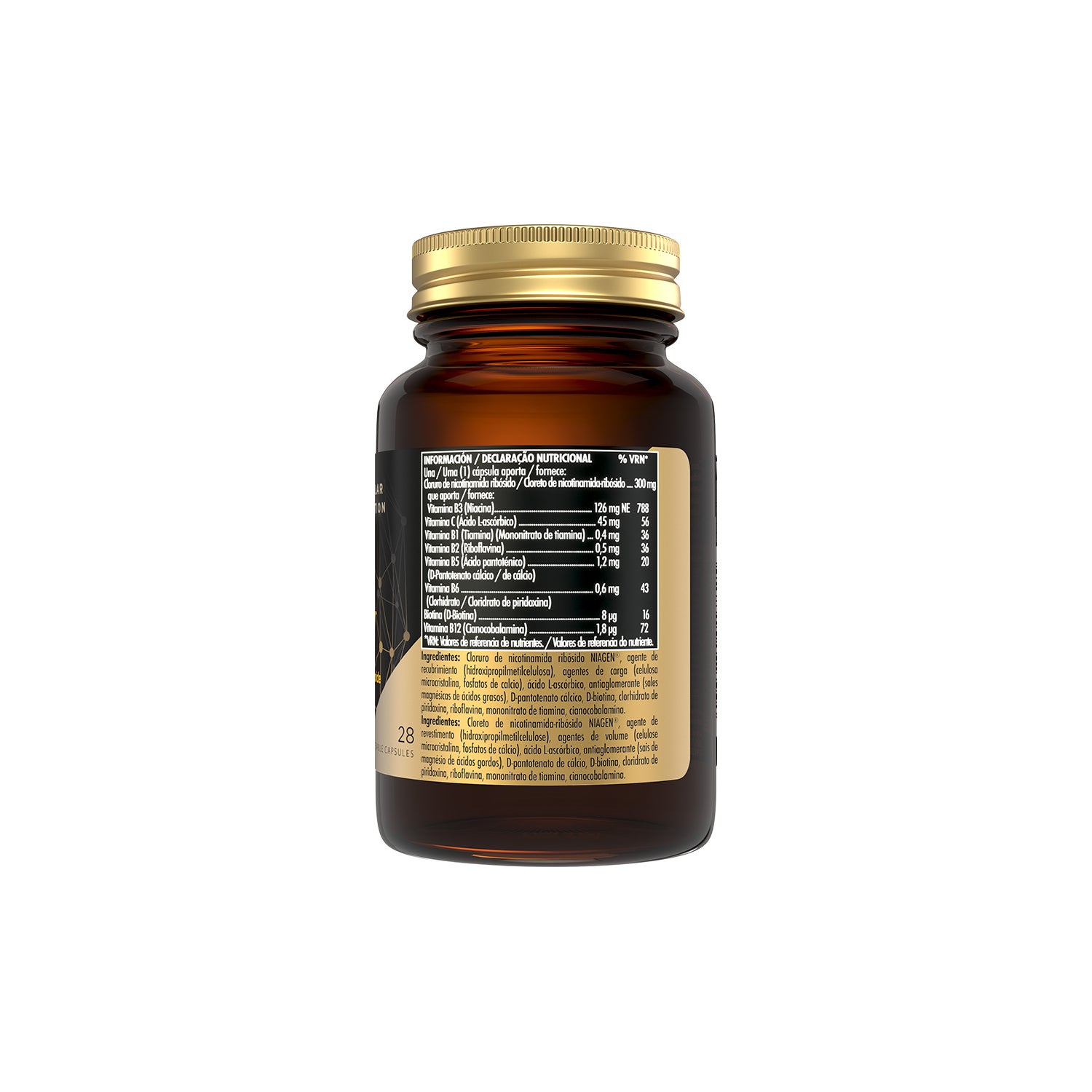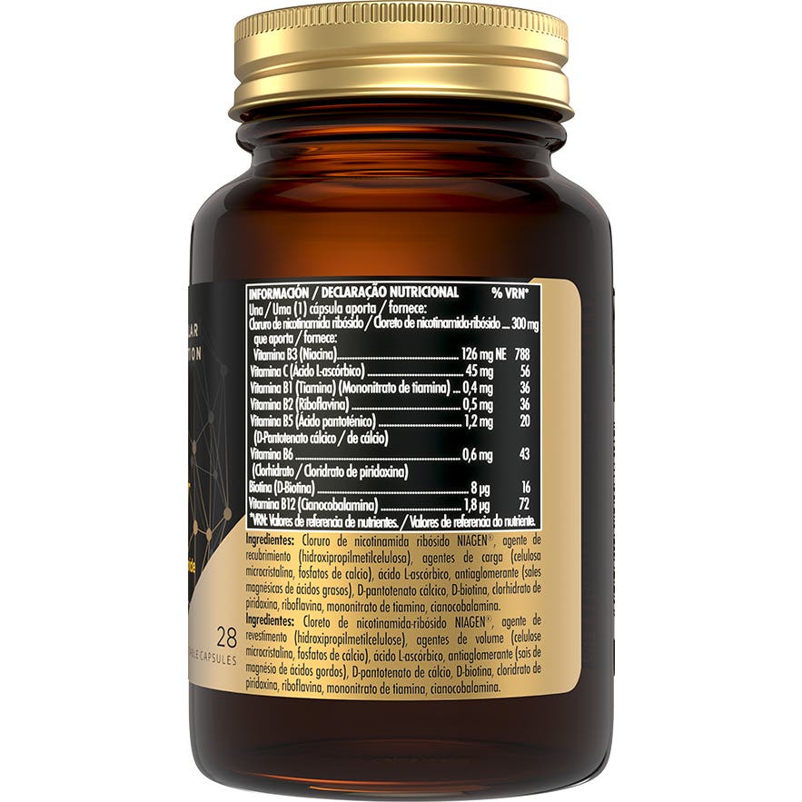 Con Niagen® ribósido de nicotinamida, precursor de NAD+ y fuente de vitamina B3.