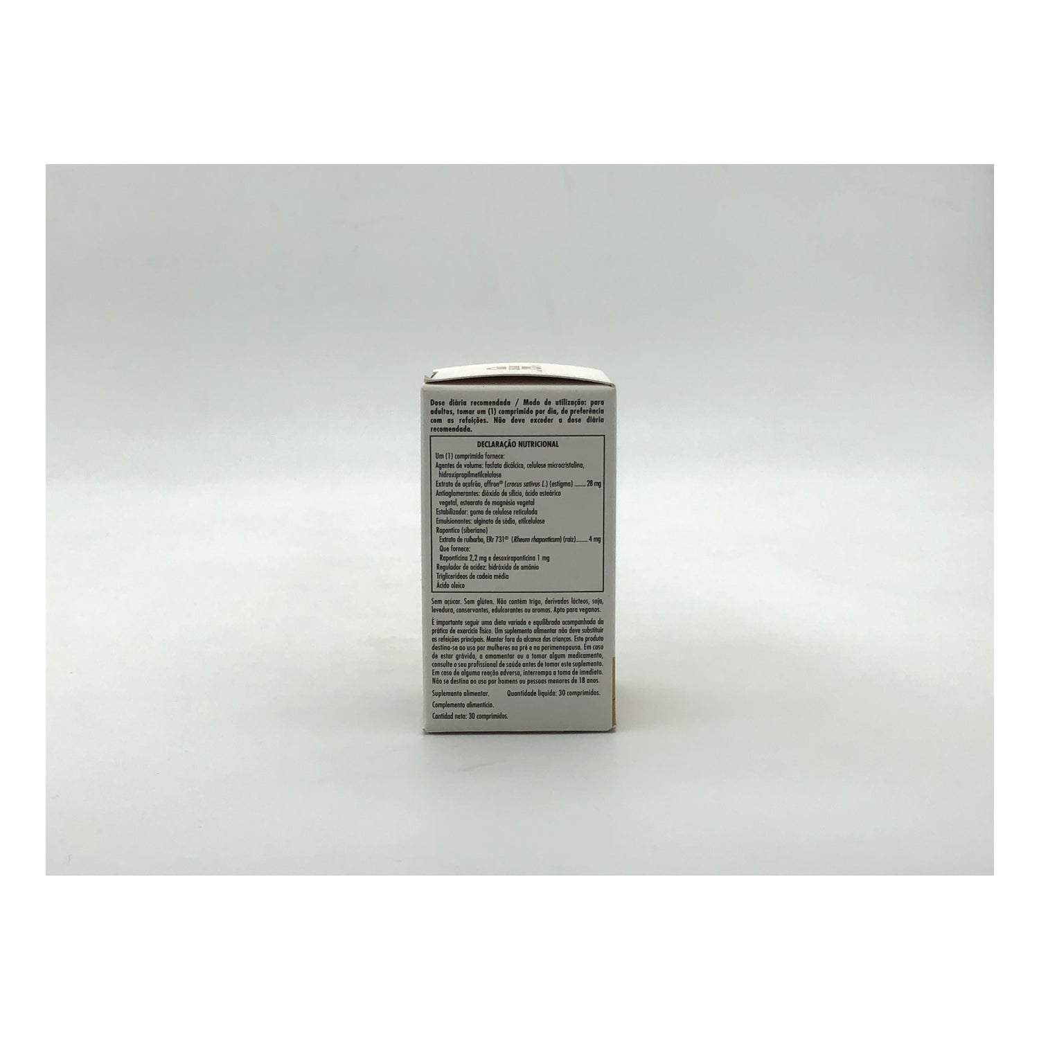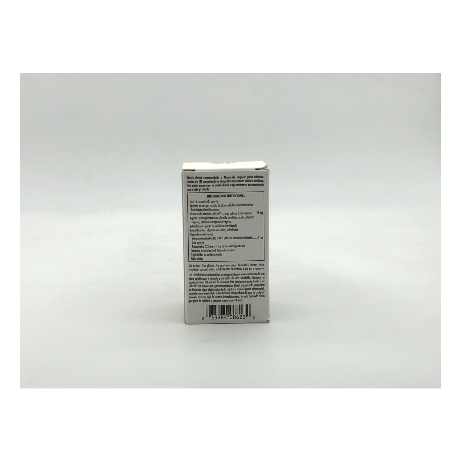 Elaborado a base de ingredientes de origen vegetal estudiados científicamente a base de plantas, ruibarbo siberiano (ERr-731®) y azafrán (affron®). Además, no contiene trigo, derivados lácteos, soja, levadura, conservantes, gluten, edulcorantes ni aromas.
