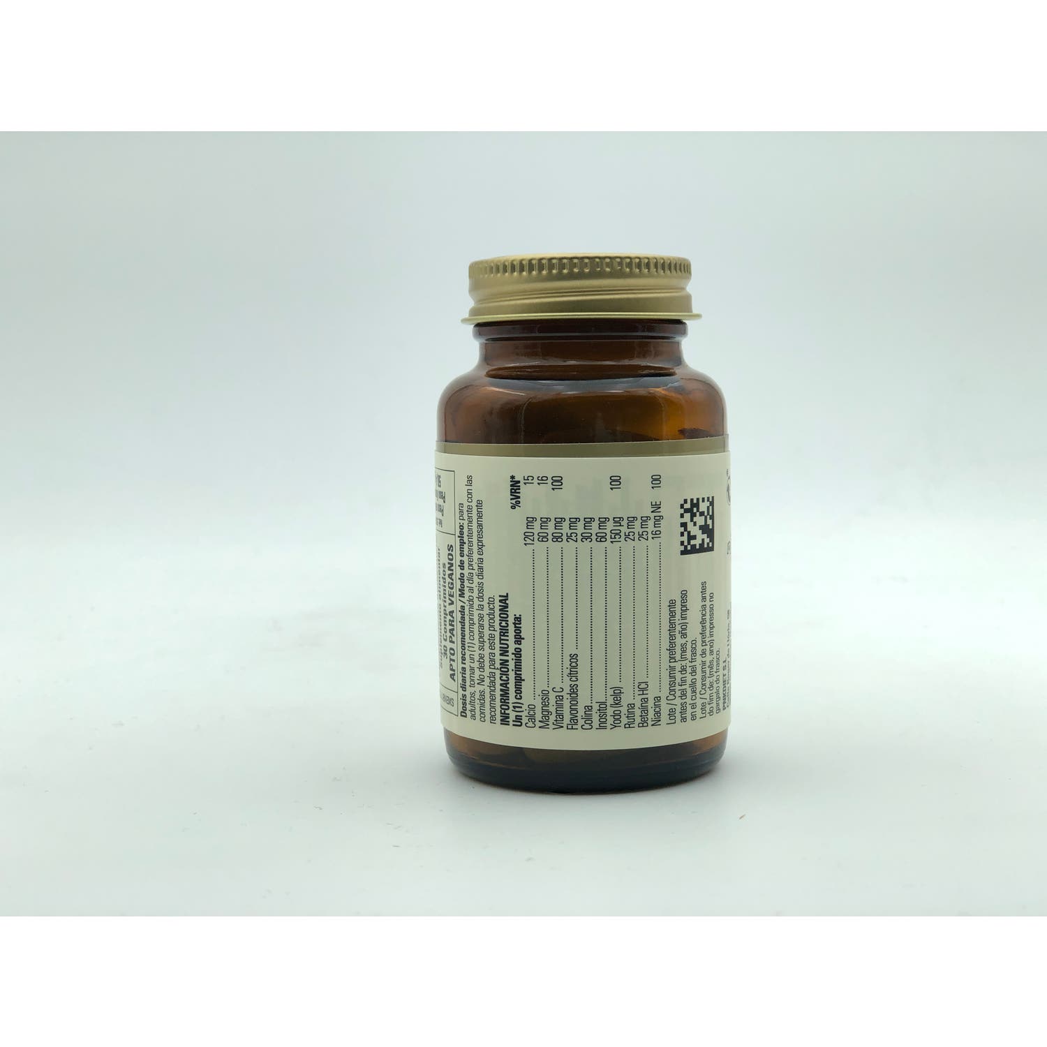 Agentes de carga (celulosa microcristalina, manitol), calcio (carbonato, bisglicinato†), magnesio (óxido, bisglicinato†), vitamina C (ácido L-ascórbico), flavonoides cítricos, estabilizantes (hidroxipropilmetilcelulosa, carboximetilcelulosa sódica reticulada), colorantes (zumo de rábano picante concentrado, grosella negra y manzana, extracto de espirulina), colina (bitartrato), vitamina A (betacaroteno), inositol, antiaglomerantes (ácidos grasos, dióxido de silicio, sales magnésicas de ácidos grasos), yodo [alga kelp (Ascophyllum nodosum)], rutina en polvo, clorhidrato de betaína, niacina (nicotinamida), vitamina E (succinato ácido de D-alfa tocoferilo), agentes de recubrimiento (hidroxipropilmetilcelulosa, glicerol, cera de carnauba), zinc (óxido, bisglicinato†), hierro (bisglicinato†), boro (ácido bórico), cobre (bisglicinato†), ácido pantoténico (D-pantotenato de calcio), manganeso (bisglicinato†), selenio (L-seleniometionina), D-biotina, hesperidina en polvo, mezcla de hierbas en polvo (alfalfa (Medicago sativa), extracto de acerola (Malpighia glabra), perejil (Petroselinum crispum), berro (Nasturtium officinale) y escaramujo (Rosa canina)), vitamina D2, ácido fólico (ácido pteroilmonoglutámico), vitamina B6 (clorhidrato de piridoxina), riboflavina, tiamina (mononitrato de tiamina), cromo (picolinato), vitamina B12 (cianocobalamina).
