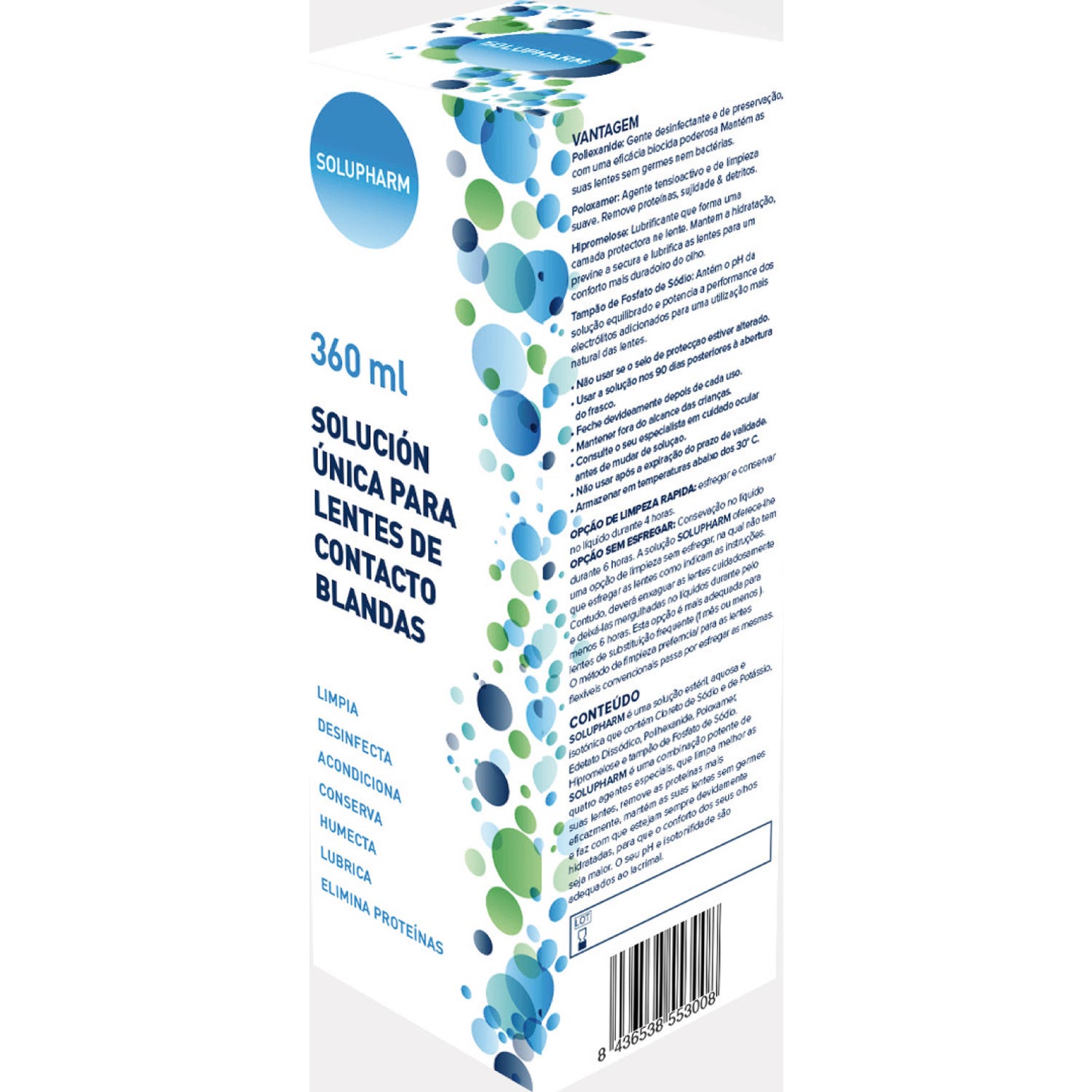 Por esta razón, la solución única para lentes de contacto blandas de Solupharm es buena para tus ojos. Una solución estéril e isotónica, eficaz para limpiar, aclarar, acondicionar, conservar, lubricar, desinfectar, mantener y eliminar los depósitos de la superficie de la lente, incluidos los lípidos y las proteínas, y rehidratar las lentes de contacto blandas. Sólo tienes que frotar y sumergir durante cuatro horas las lentes en la solución, y tendrás asegurada una buena limpieza.