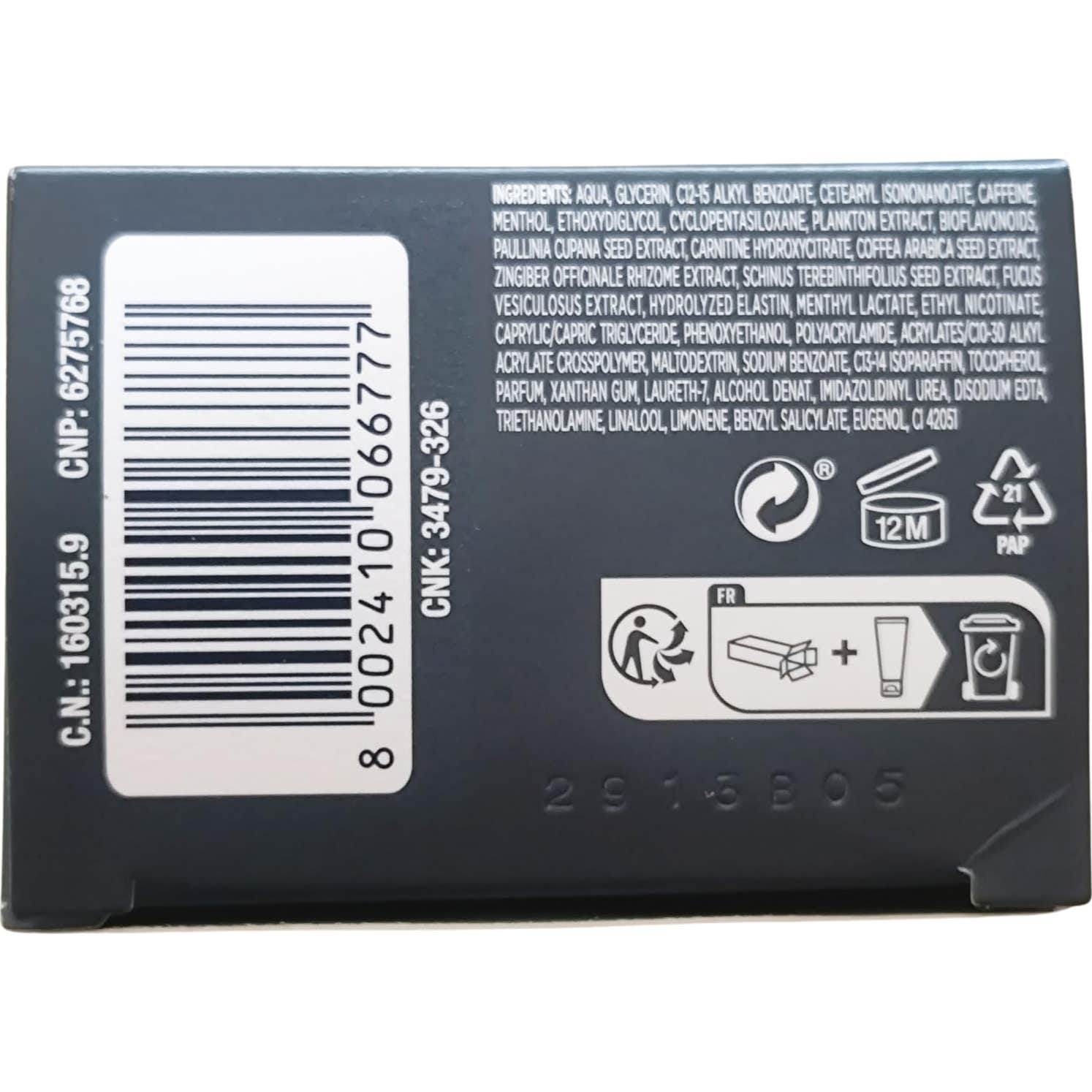 AGUA, CICLOPENTASILOXANO, CAFEÍNA, PENTILENGLICOL, GLICERINA, CAPRILIC/CAPRIC TRIGLICÉRIDO, ALCOHOL CETEARÍLICO, CETEARIL SODIO, SULFATO, ALQUILBENZOATO, SALICILATO SÓDICO, PERFUME, EXTRACTO DE ZINGIBER OFFICINALES, MENTOL, EXTRACTO DE QUILLAJA SAPONARIA, EXTRACTO DE PAULLINA CUPANA, EXTRACTO DEPARAGUENSIS, CERA ALBA, CARNITINA, ALCOHOL CETÍLICO, LECITIAN, BUTILENGLICOL, NICOTINATO DE ETILO, CETETH-20, ESTERATO DE GLICERINA, PEG-75 ESTERATO, GOMA XANTINA, HIDRÓXIDO SÓDICO, BENZOATO DE SALICILATO, EUGENOL, LIMONENE, LINAOL, ACRILATOS, EXTRACTO DE CACAO, EXTRACTO DE FUCUS VESICULLOSUS, CAFEÍNA.