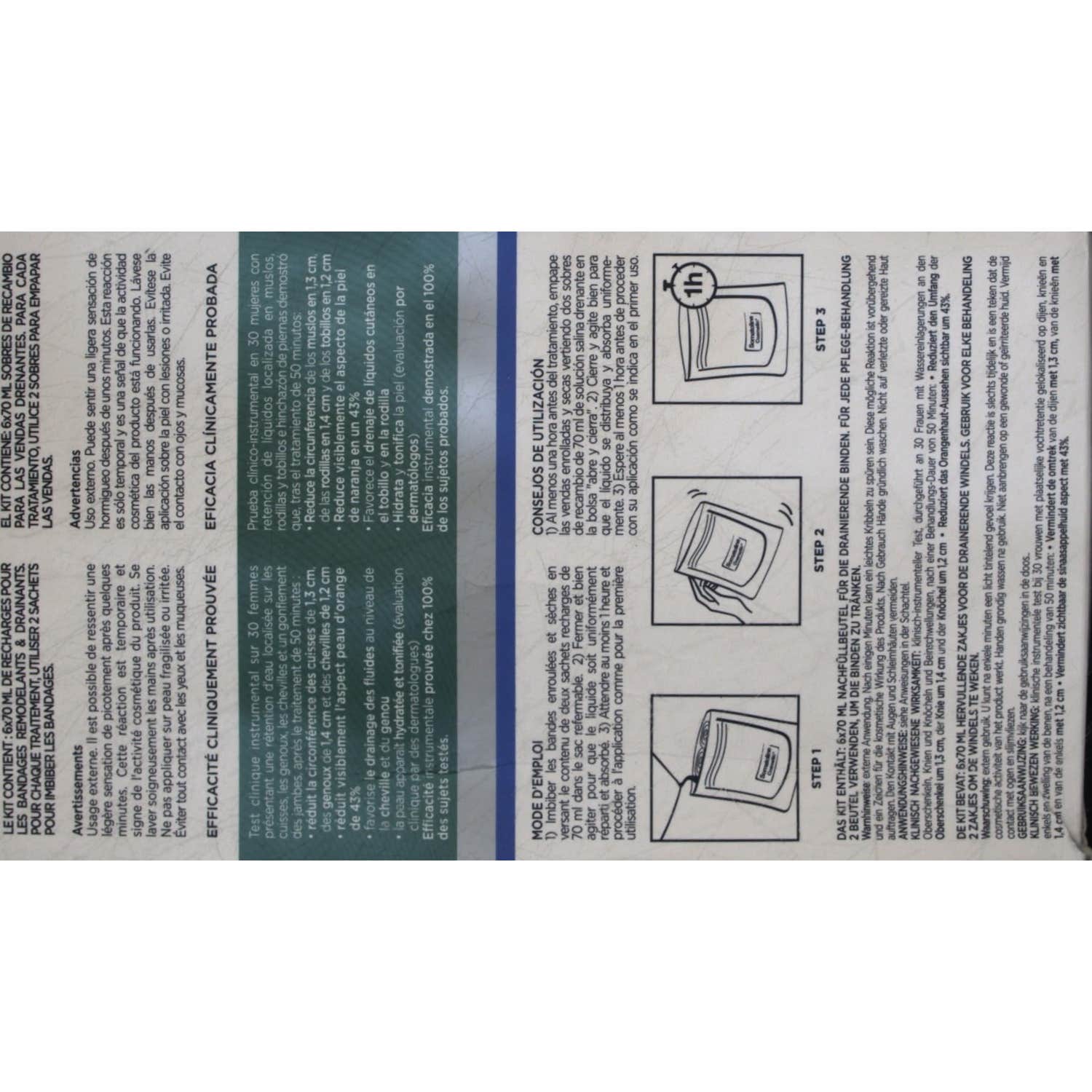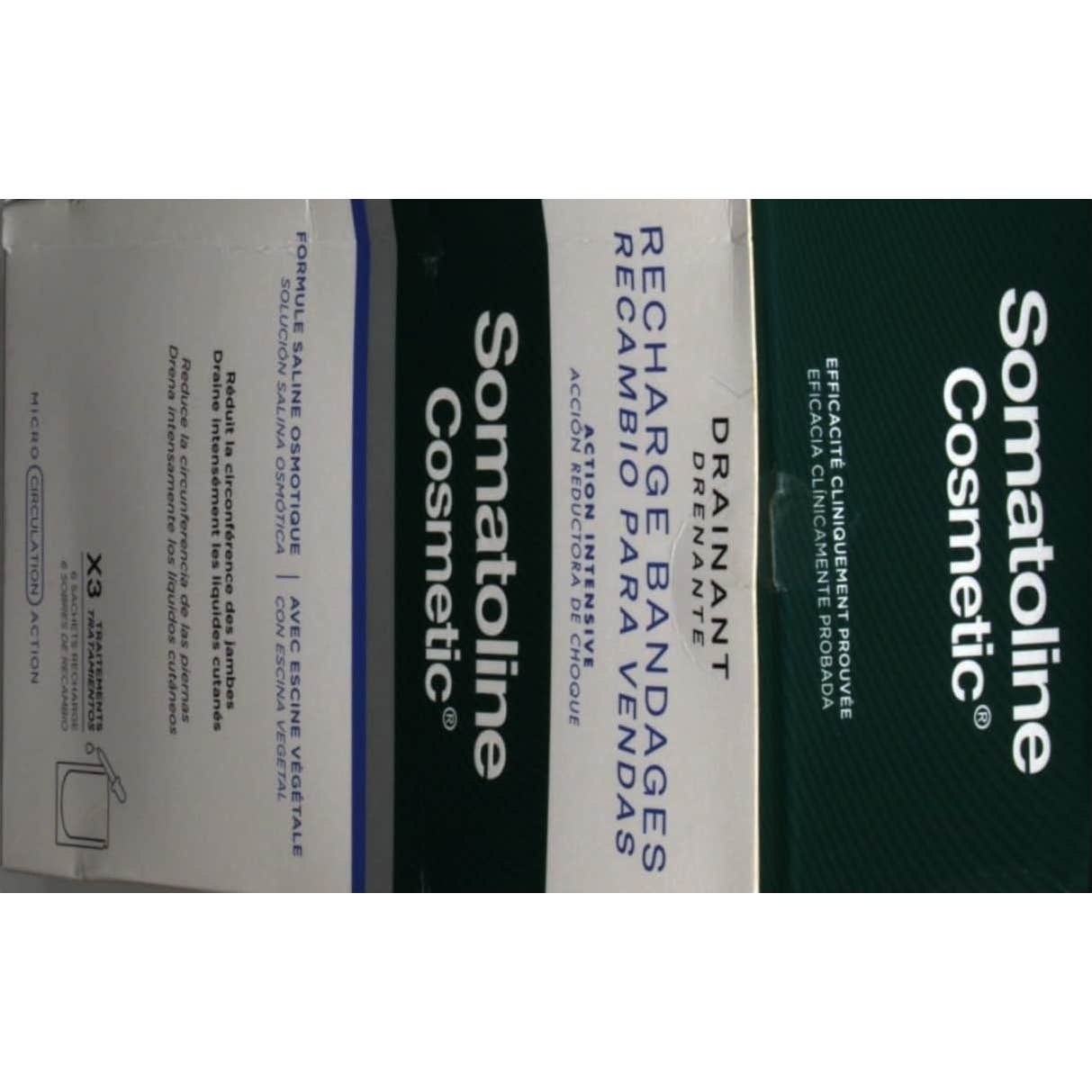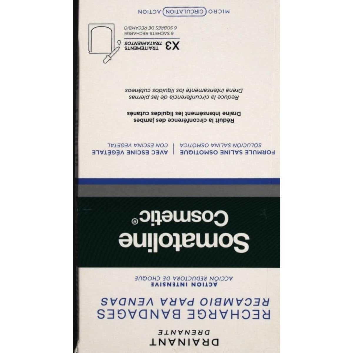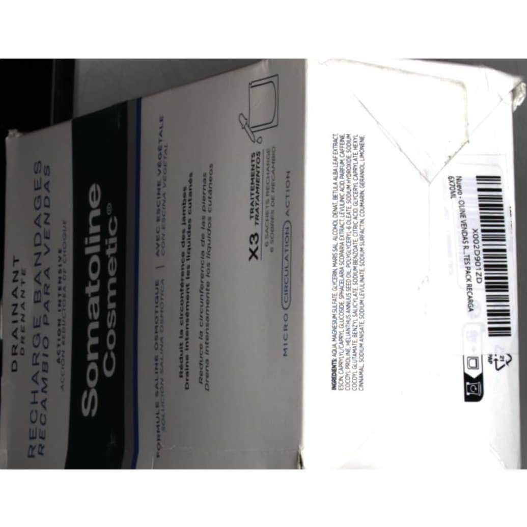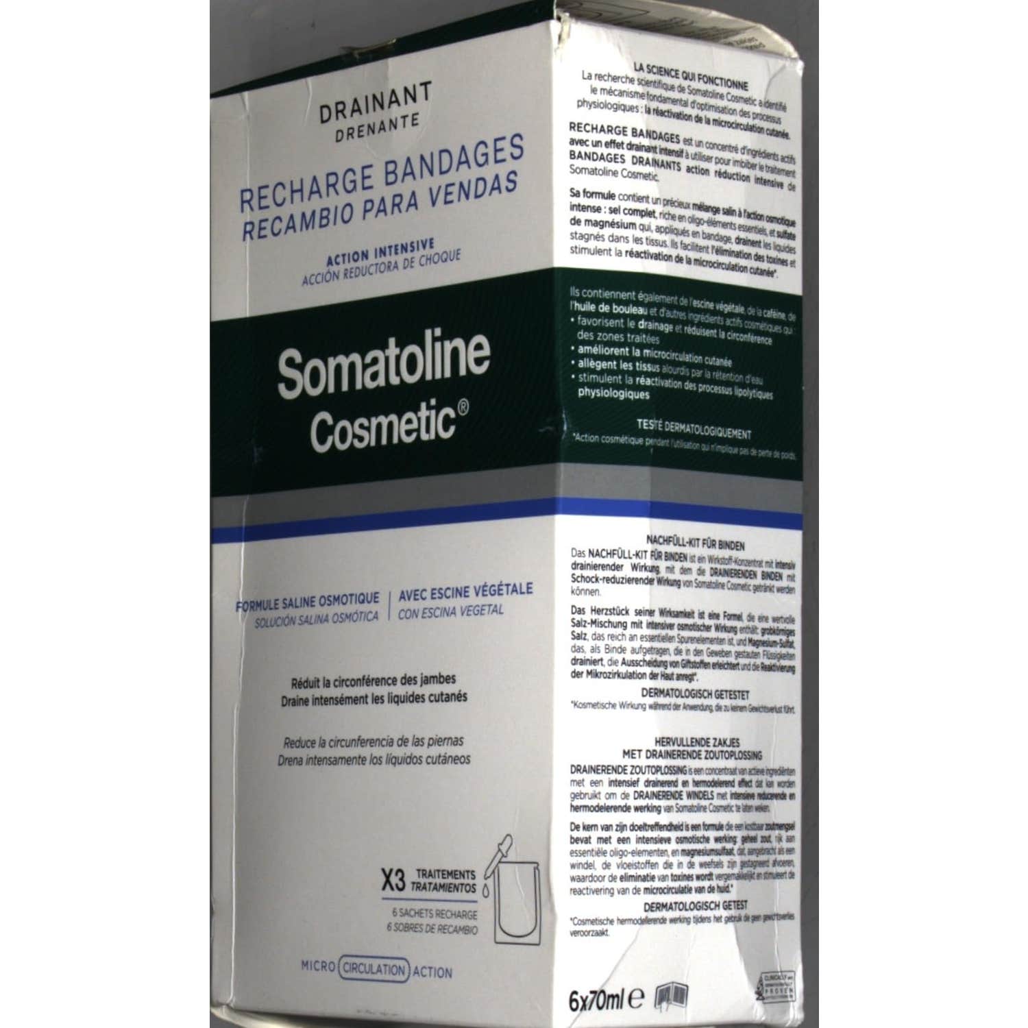 Somatoline Cosmetic Recambio Para Vendas Drenantes 6uds es un pack de 6 sobres de 70ml (equivalentes a 3 tratamientos) de solución salina osmótica para las vendas drenantes Somatoline.