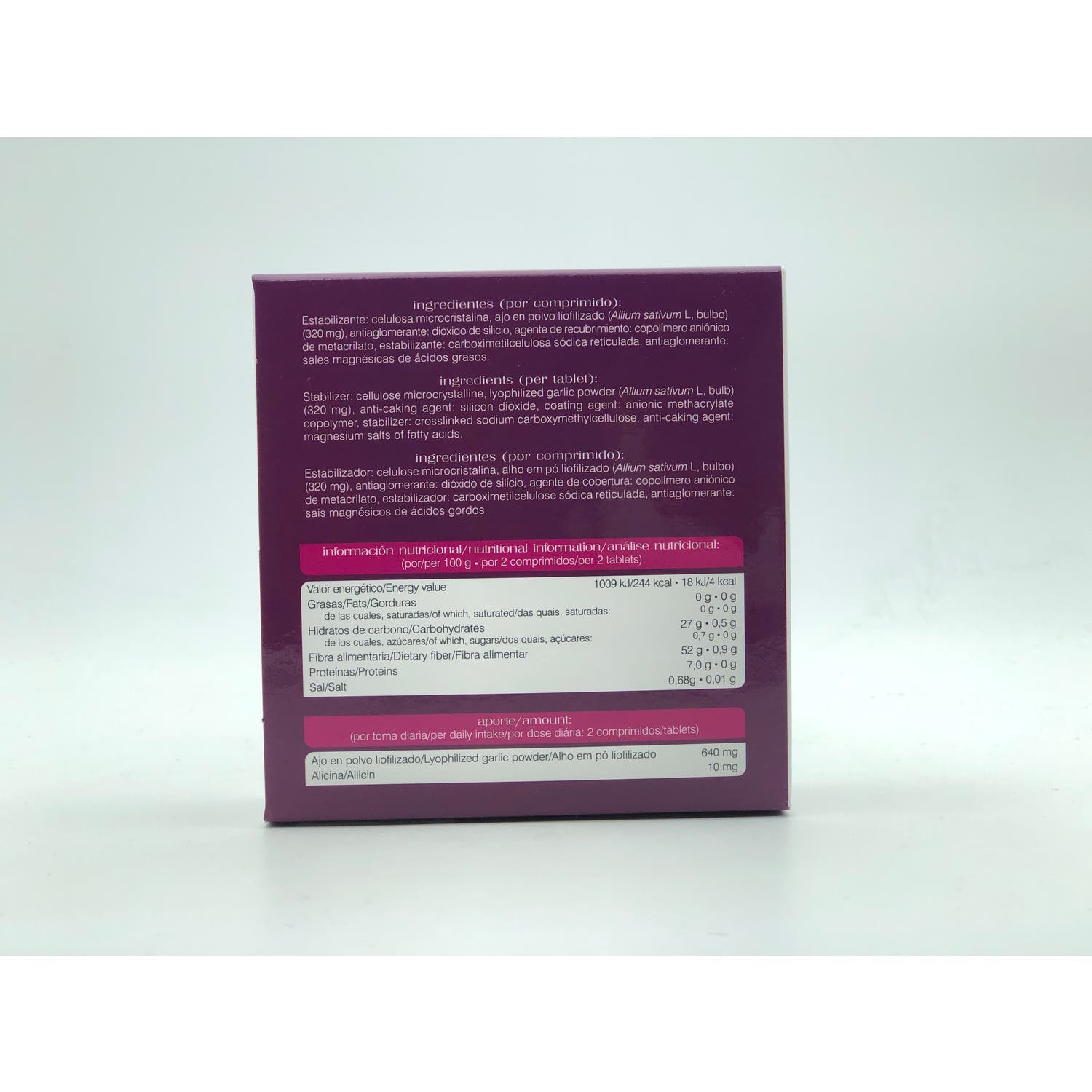 Complemento alimenticio formulado a base de ajo en polvo y silicio. Contiene alicina y fibra en grandes cantidades.