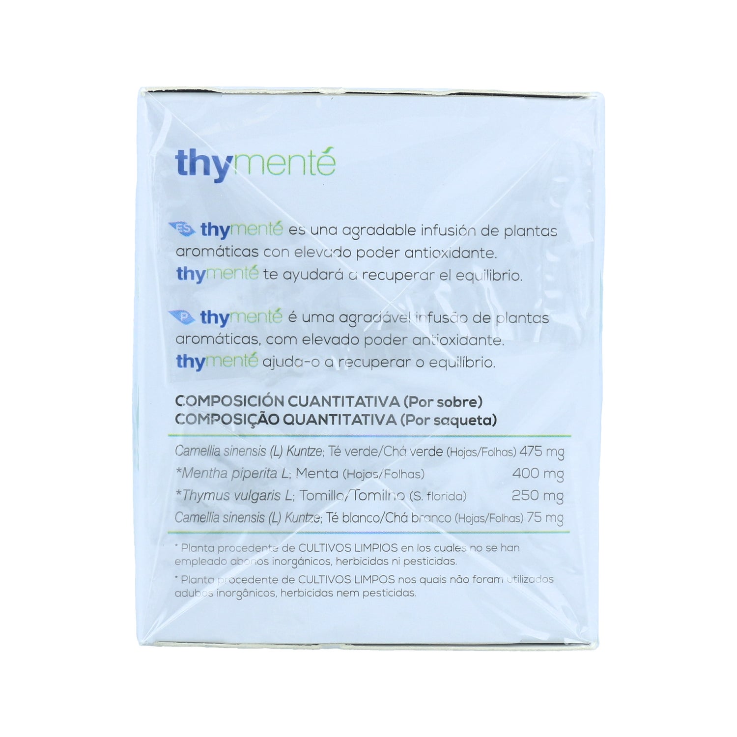 Las bolsitas Thymente de Soria Natural son infusiones con té, menta y tomillo que ayudan a recuperar el equilibrio y correcto funcionamiento del organismo. Gracias a su alto poder antioxidante y su agradable sabor a plantas aromáticas, se hacen imprescindibles en tu hogar. Te recomendamos toma una bolsita de Thymente después de cada comida. Perfectas para controlar tu peso y para favorecer tu digestión y funcionamiento del sistema hepato-digestivo.