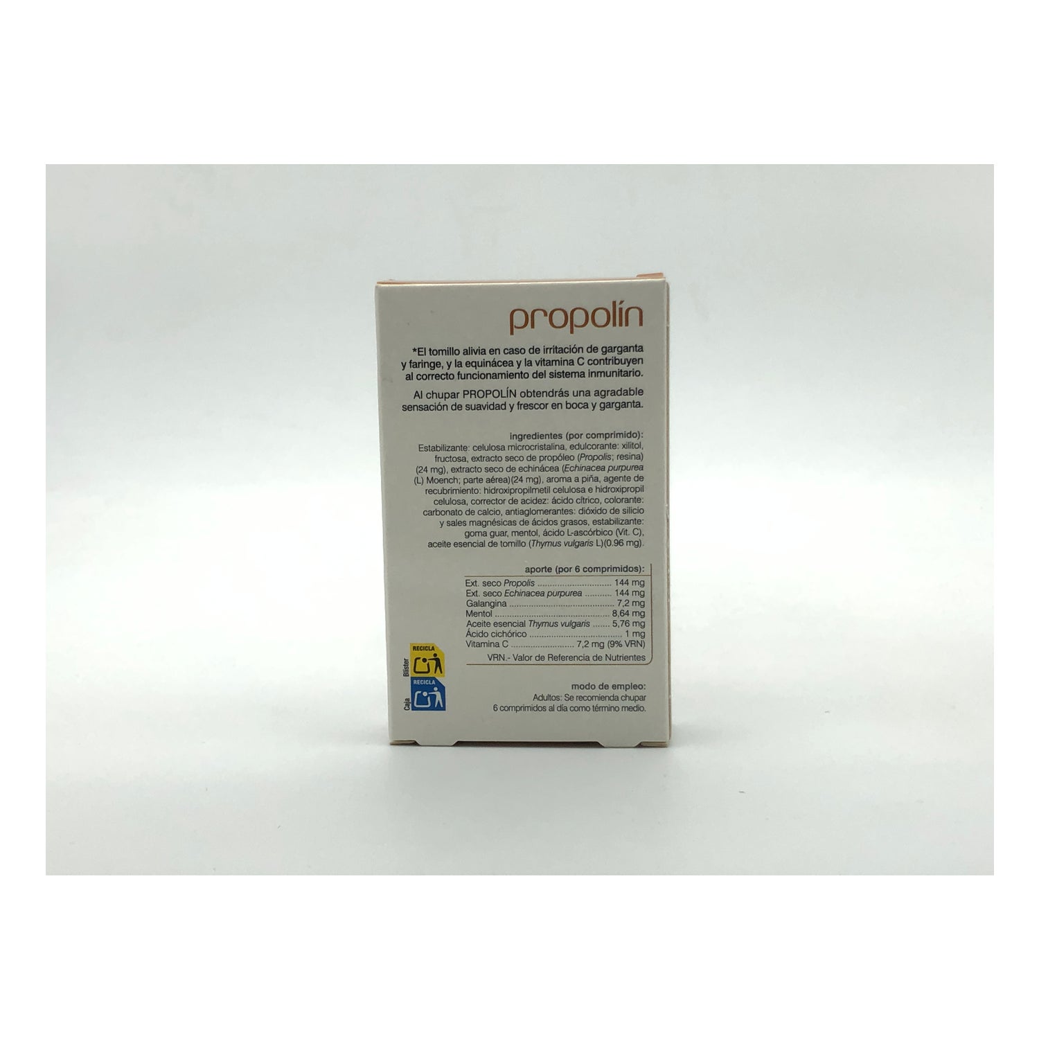 EDULCORANTE: XILITOL , FRUCTOSA, EXTRACTO SECO DE PROPÓLEO (24 MG), EXTRACTO SECO DE ECHINACEA (ECHINACEA PURPUREA L) (SUMIDA DE FLORES) (24 MG), ESTABILIZANTES : CELULOSA MICROCRISTALINA SILICIFICADA (CELULOSA MICROCRISTALINA Y DIÓXIDO DE SILICIO), CELULOSA MICROCRISTALINA , HIDROXIPROPILMETILCELULOSA, AROMA DE PIÑA , CORRECTOR DE ACIDEZ : ÁCIDO CÍTRICO , ANTIAGLOMERANTES : DIÓXIDO DE SILICIO, SAL MAGNÉSICA DE ÁCIDOS GRASOS , MENTOL, ÁC ASCÓRBICO (VIT C), COLORANTE: ÓXIDOS DE HIERRO, ESTABILIZANTE : GOMAR GUAR, ACEITE ESENCIAL DE TOMILLO (THYMUS VULGARIS L ) (PARTE AÉREA ) (0,96 MG).