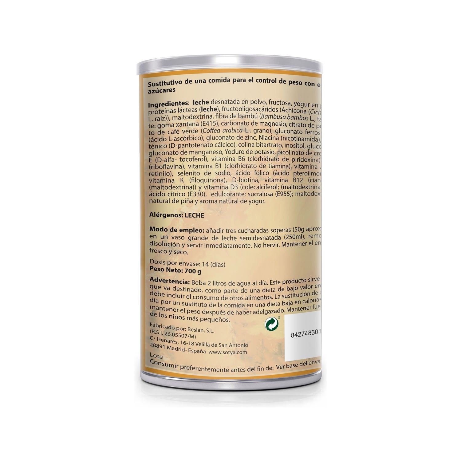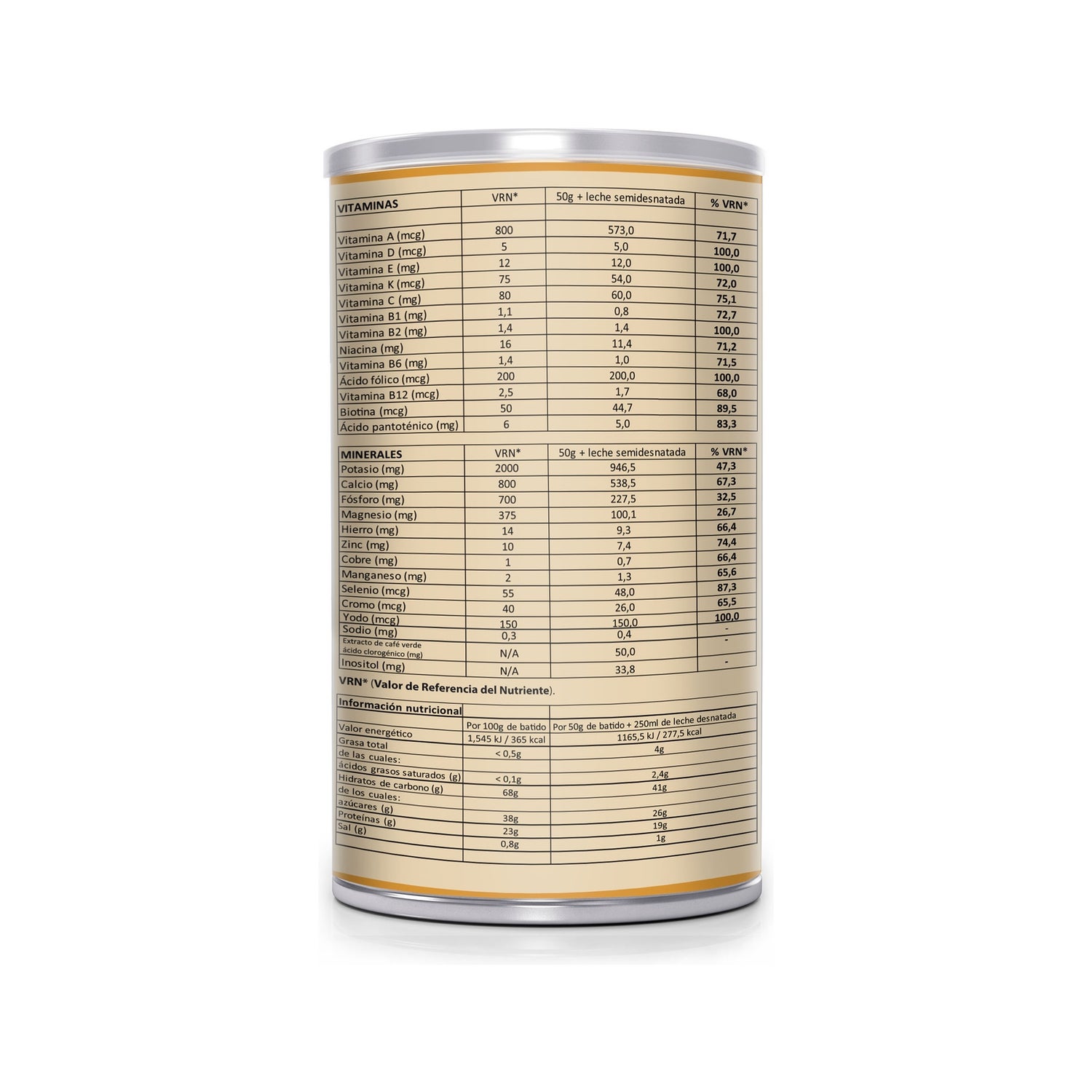 Leche desnatada en polvo, fructosa, proteínas lácteas (leche), fructooligosacáridos (fibra de achicoria), maltodextrina, fibra de bambú (Bambusa bambos (L.) Voss, tallo), espesante: goma xantana (E415), carbonato de magnesio, citrato potásico, extracto café verde (Coffea arabica L., grano), gluconato de hierro, ácido L-ascórbico (vitamina C), gluconato de zinc, nicotinamida (vitamina B3), D-pantotenato cálcico (vitamina B5), colina bitartrato, inositol, gluconato de cobre, gluconato de manganeso, yoduro potásico, picolinato de cromo, Acetato de D-alfa tocoferilo (vitamina E), piridoxina clorhidrato (vitamina B6), riboflavina (vitamina B2), tiamina clorhidrato (vitamina B1), acetato de retinilo (vitamina A), selenito sódico, ácido pteroilglutámico (ácido fólico), filoquinona (vitamina K), D-biotina, cianocobalamina (vitamina B12) y colecalciferol (vitamina D3). Edulcorante: sucralosa (E955). Colorante Betacaroteno (E160).