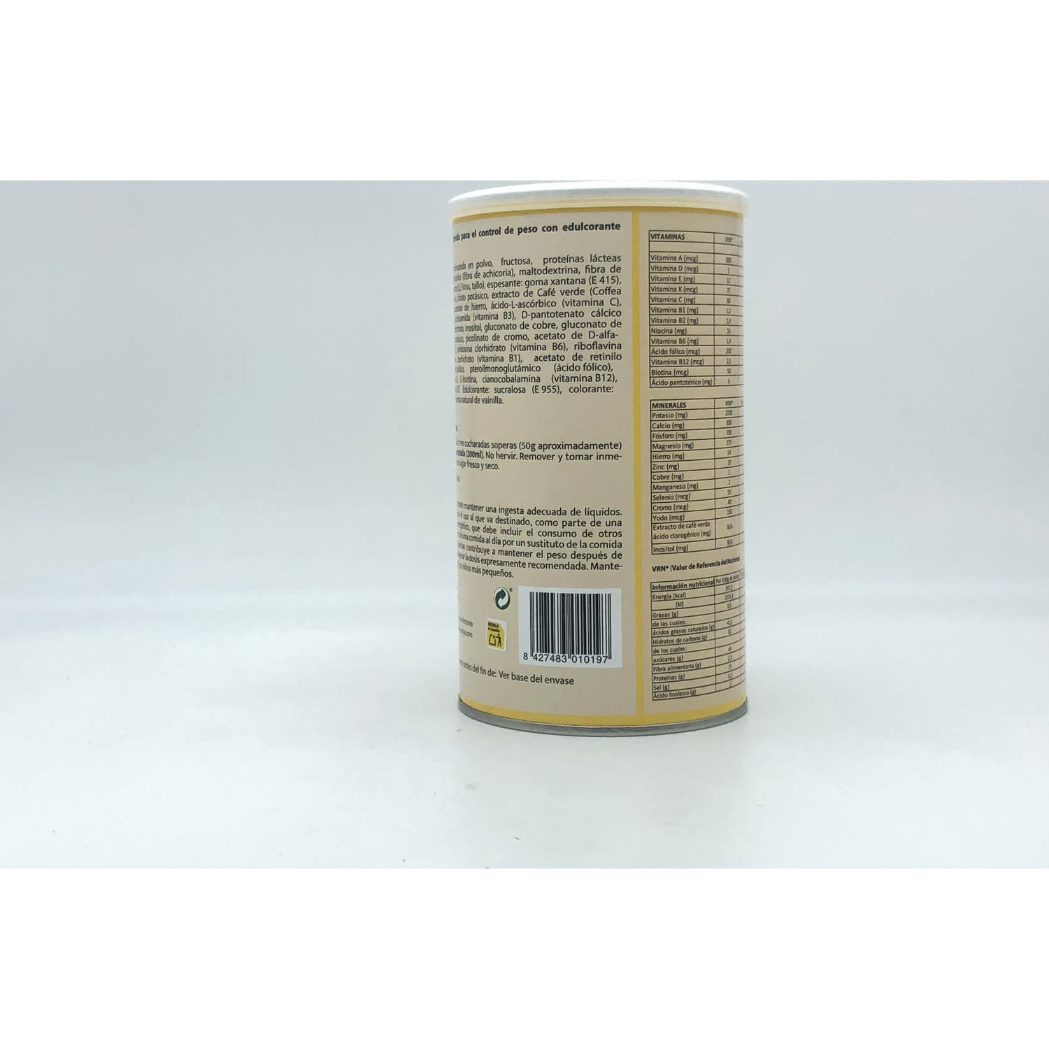Leche desnatada en polvo, fructosa, caseinato cálcico, maltodextrina, proteína de suero de leche, fructooligosacáridos, goma guar, extracto de café verde, complejo vitamínico-mineral, aromas y colorantes naturales de vainilla (E102) (E110) (E124).