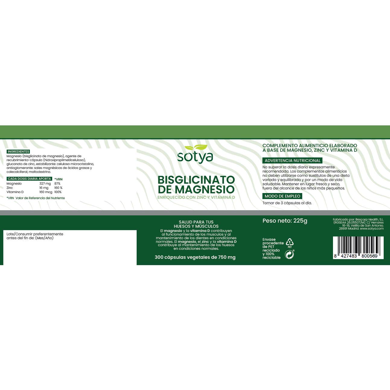Sotya Bisglicinato de Magnesio 300caps es un complemento alimenticio en cápsulas vegetales formulado para aportar una combinación equilibrada de tres nutrientes esenciales: magnesio, vitamina D y Zinc.