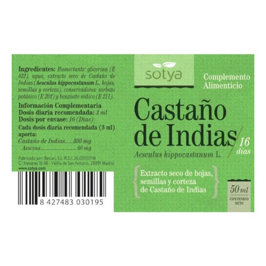 Sotya castaño de indias es un complemento alimenticio bebible que gracias a su riqueza en aesculina y aescina te ayudará a aumentar la resistencia de los vasos sanguíneos y evitar la formación de edemas. Gracias a su riqueza en flavonoides, ejerce un efecto vasoconstrictor que se traduce en una mejora de la circulación venosa.