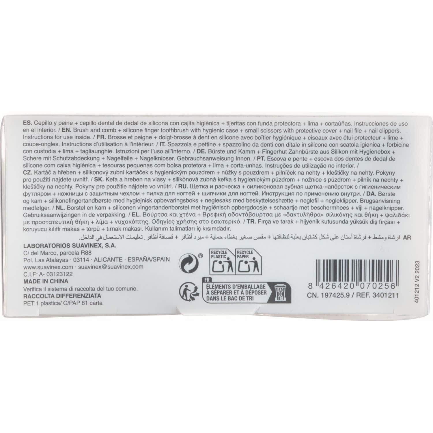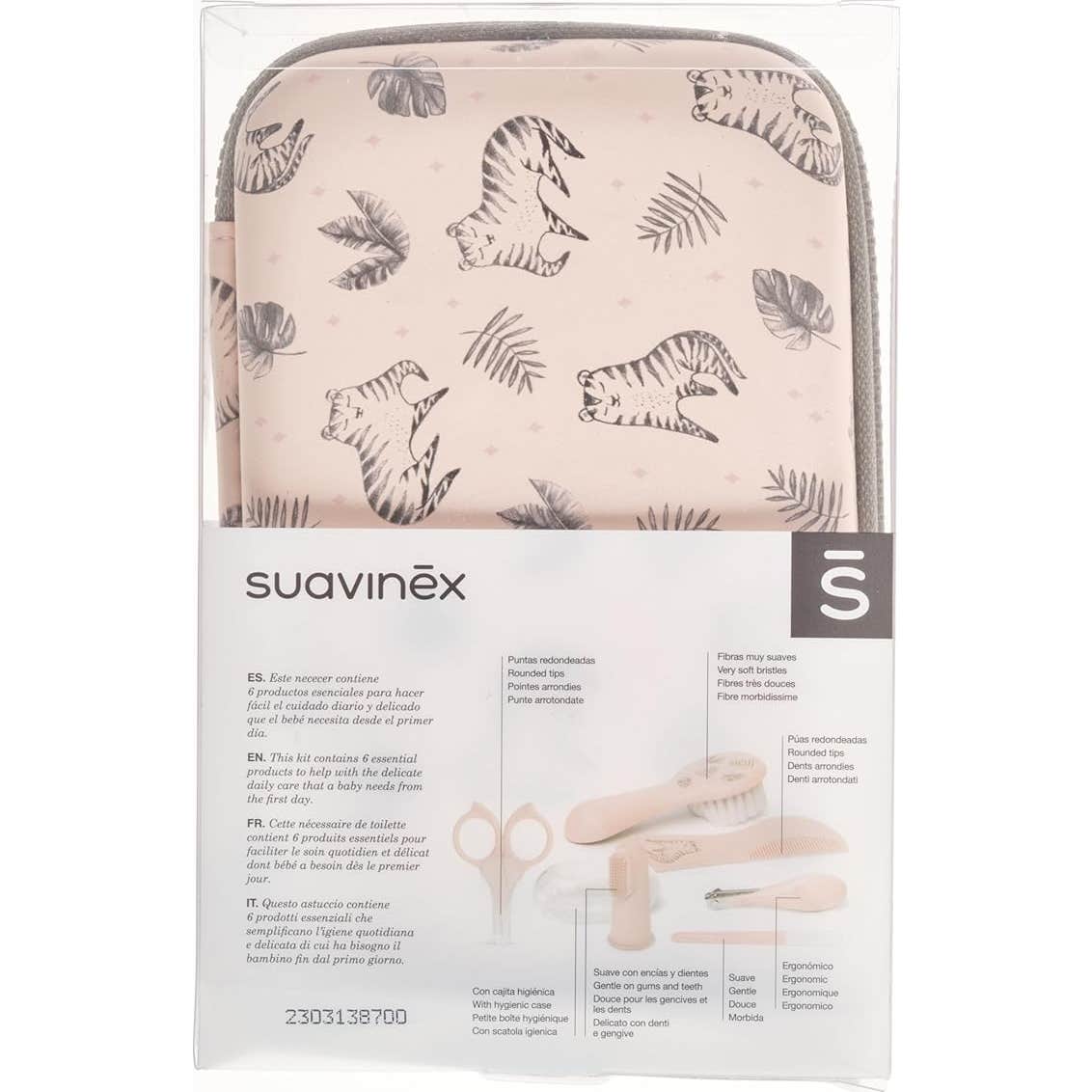 Contiene 6 productos esenciales: cepillo, peine, cepillo dental de dedal de silicona con caja higiénica, tijeras pequeñas con funda protectora, lima y cortaúñas.