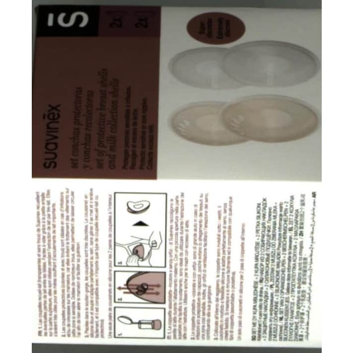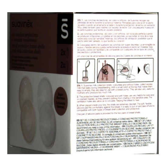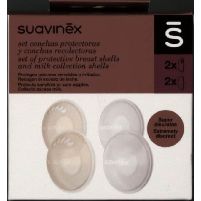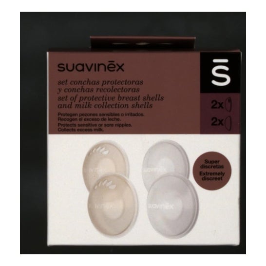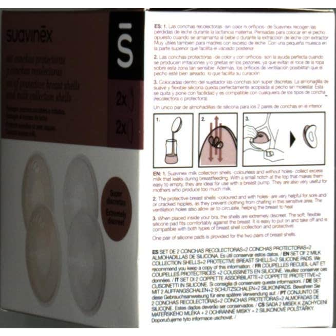 - 2 conchas recolectoras: elaboradas sin color ni orificios, que ayudan a recoger las posibles pérdidas de leche. Recomendadas para colocar en el pecho opuesto cuando se amamanta, durante el empleo del extractor o en mamas con mucha leche.