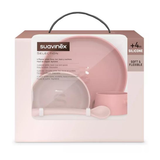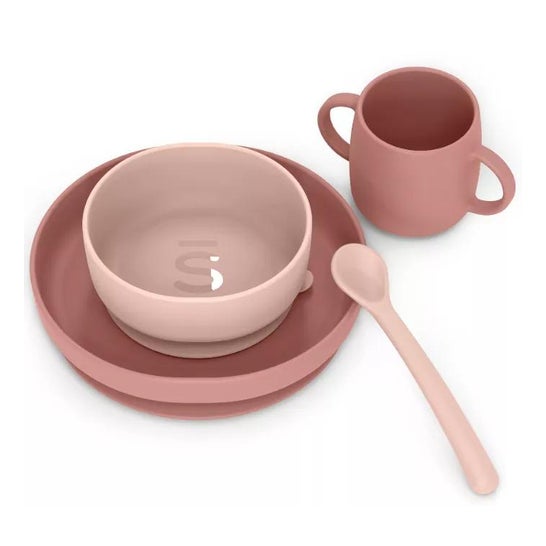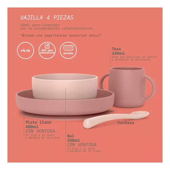 Vajilla infantil hecha de silicona de grado alimentario y pigmentos alimentarios seguros, que incluye un plato, un bol y una cuchara. Está diseñada para facilitar la transición a la alimentación sólida en los más pequeños. La vajilla es resistente, fácil de limpiar y segura para el bebé a partir de los 6 meses.