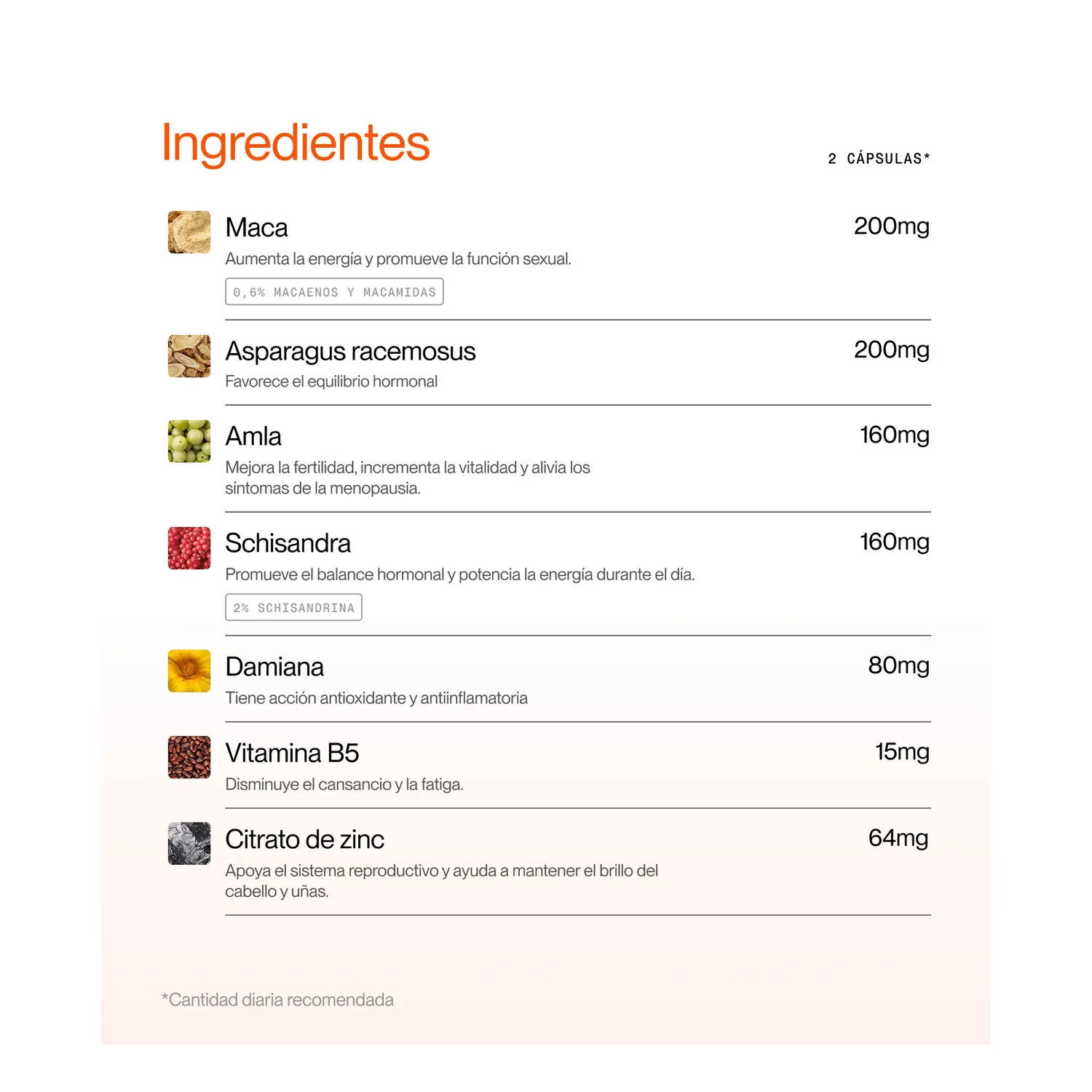 Reforzado con bayas de Amla y damiana, con propiedades que estimulan la vitalidad.
