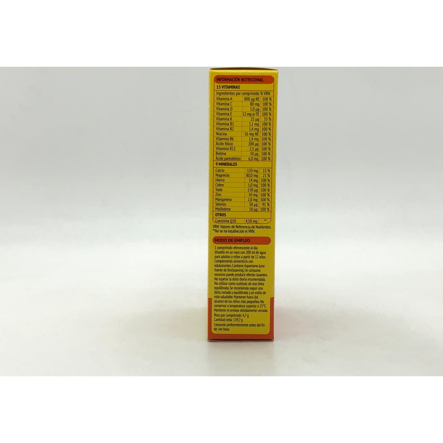 Su fórmula combina 13 vitaminas, 9 minerales y Coenzima Q10. Las vitaminas del grupo B (B2, B6 y B12) favorecen el metabolismo energético normal y reducen el cansancio y la fatiga. Por otro lado, las vitaminas C y E actúan como antioxidantes, protegiendo las células frente al daño oxidativo.