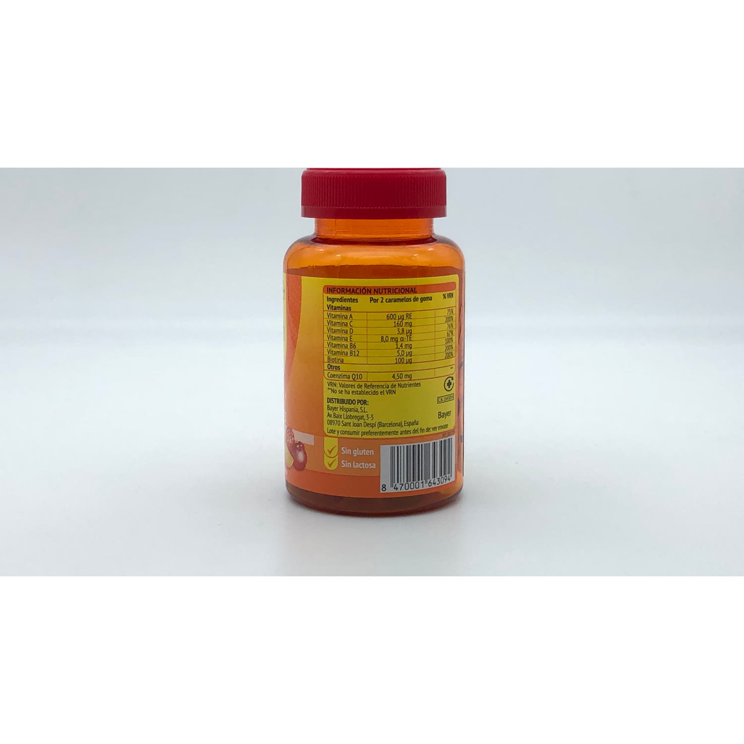 Jarabe De Glucosa; Azúcar; Gelatina; Ácido L-Ascórbico; Coenzima Q10; Colorante Rojo [Concentrado De Grosella Y Zanahoria, Agua, Jarabe De Azúcar Invertido Y Ácido Cítrico (E330) (Corrector De La Acidez)]; Acetato De Dl-Alfa-Tocoferilo; Aroma De Cereza [Extractos Aromatizantes, Saborizantes Naturales, Cafeína (4 Mg/Kg), Propilenglicol (E1520), Etanol, Glicerina (E422) Y Agua]; Agente De Recubrimiento Capol [Aceite Vegetal, Cera Carnauba (E903) Y Cera De Abejas (E901) (Agente De Recubrimiento)]; Clorhidrato De Piridoxina; Acetato De Retinilo; Ácido Teroilmonoglutámico; D-Biotina; Cianocobalamina; Colecalciferol.