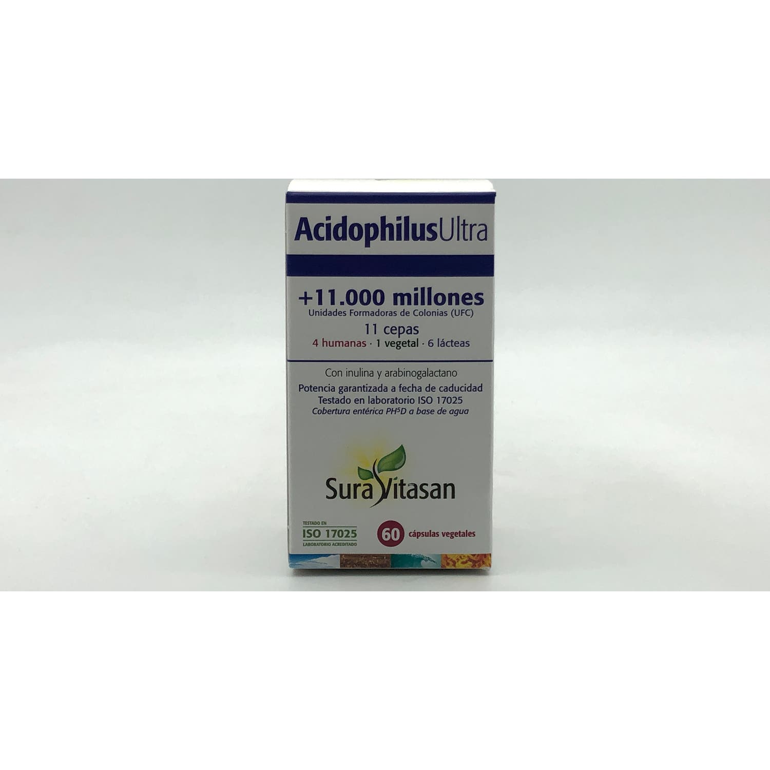 Sura Vitasan Acidophilus Ultra 60 Cápsulas es un complemento que aporta aproximadamente 11.000 millones de bacterias viables por cápsula con cobertura entérica. Proporciona una óptima protección frente a las secreciones ácidas del estómago.