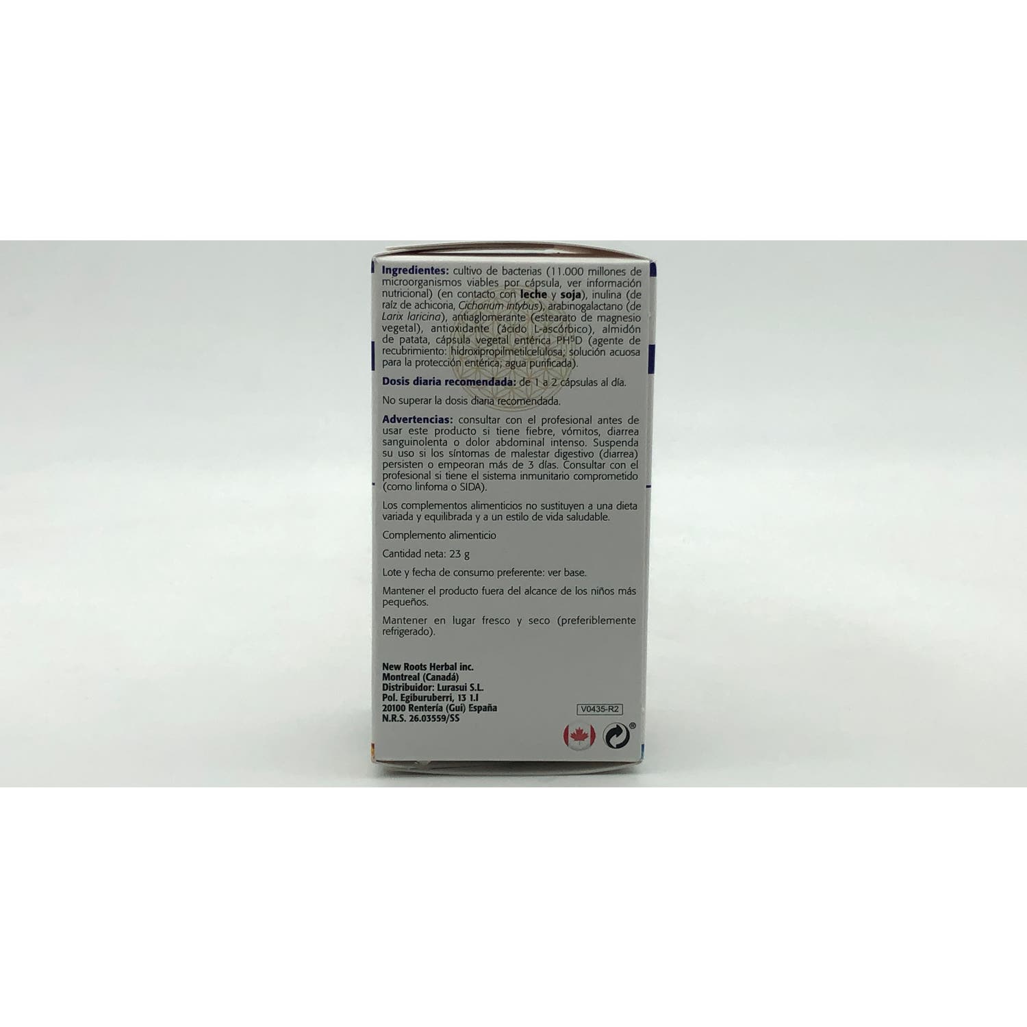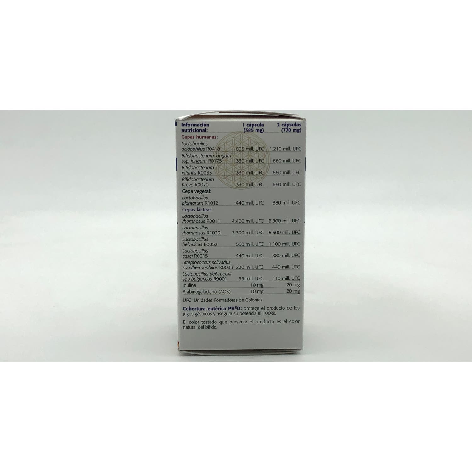 Cultivo de bacterias (11.000 mill. de microorganismos viables por cápsula, ver información nutricional) (en contacto con leche y soja), inulina (de raíz de achicoria, Cichorium intybus), arabinogalactano (de Larix laricina), antiaglomerante (estearato de magnesio vegetal), antioxidante (ácido L-ascórbico), almidón de patata, cápsula vegetal entérica PH5D (agente de recubrimiento: hidroxipropilmetilcelulosa; solución acuosa para la protección entérica; agua purificada).