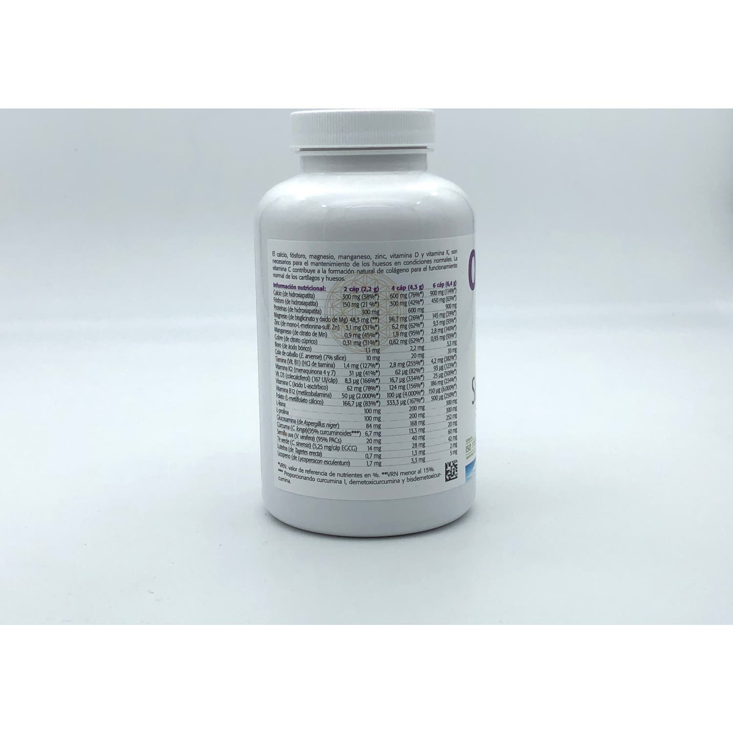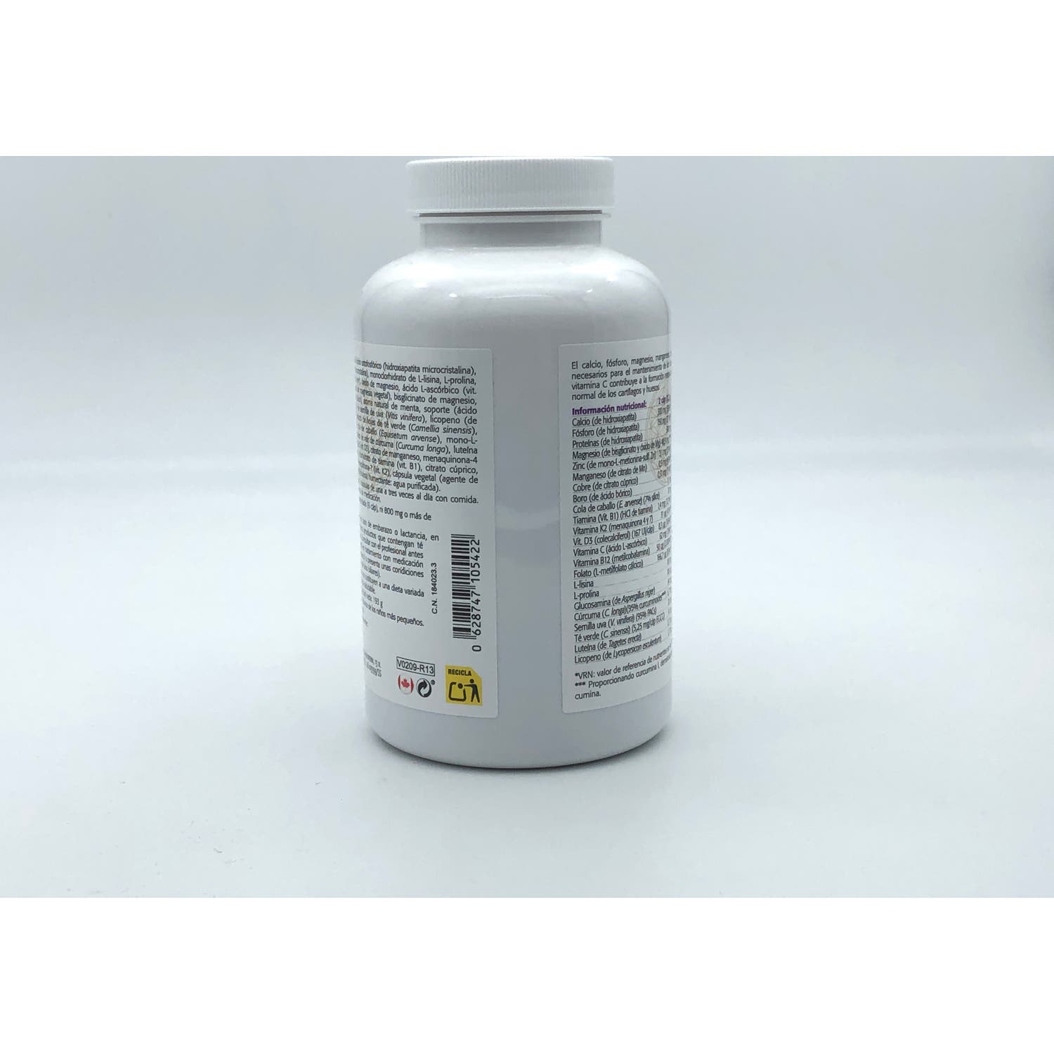 Sales cálcicas de ácido ortofosfórico (hidroxiapatita microcristalina), proteínas (de hidroxiapatita microcristalina), bisglicinato de magnesio, monoclorhidrato de L-lisina, L-prolina, sulfato de glucosamina (de crustáceos), ácido L-ascórbico, antiaglomerantes (estearato de magnesio vegetal y dióxido de silicio), aroma natural de menta, soporte (ácido cítrico), ácido bórico, extracto de semilla de uva (Vitis vinifera), extracto de hojas de té verde (Camellia sinensis), extracto de parte aérea de cola de caballo (Equisetum arvense), licopeno (de Lycopersicon esculentum), mono-L-metionina-sulfato de zinc, extracto de raíz de cúrcuma (Curcuma longa), vitamina B12 (metilcobalamina), luteína (de Tagetes erecta), vitamina D3 (colecalciferol), citrato de manganeso, vitamina K2 (menaquinona-4), L-metilfolato cálcico, clorhidrato de tiamina, citrato cúprico, vitamina K2 (menaquinona-7), cápsula vegetal (agente de recubrimiento: hidroxipropilmetilcelulosa; humectante: agua purificada).