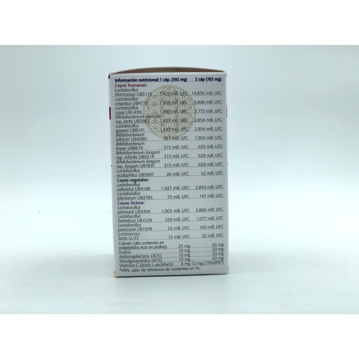 Elaborado a base de una combinación de 16 cepas probióticas seleccionadas (10 de origen humano, 2 vegetales y 4 lácteas), calostro bovino, inulina (achicoria), A.O.S y xilooligosacáridos (XOS). Además, aporta alrededor de 20.000 millones de bacterias por cápsula.