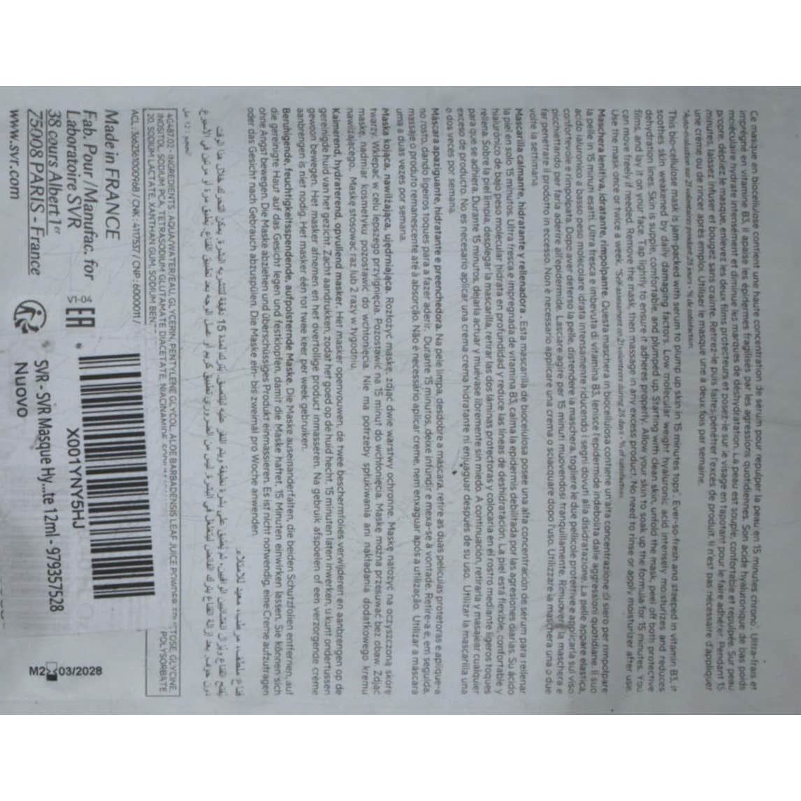 SVR [B3] Masque Hydra Intensif Mascarilla Calmante Rehidratante 12ml es una mascarilla facial hidratante para el tratamiento nutritivo de la piel.