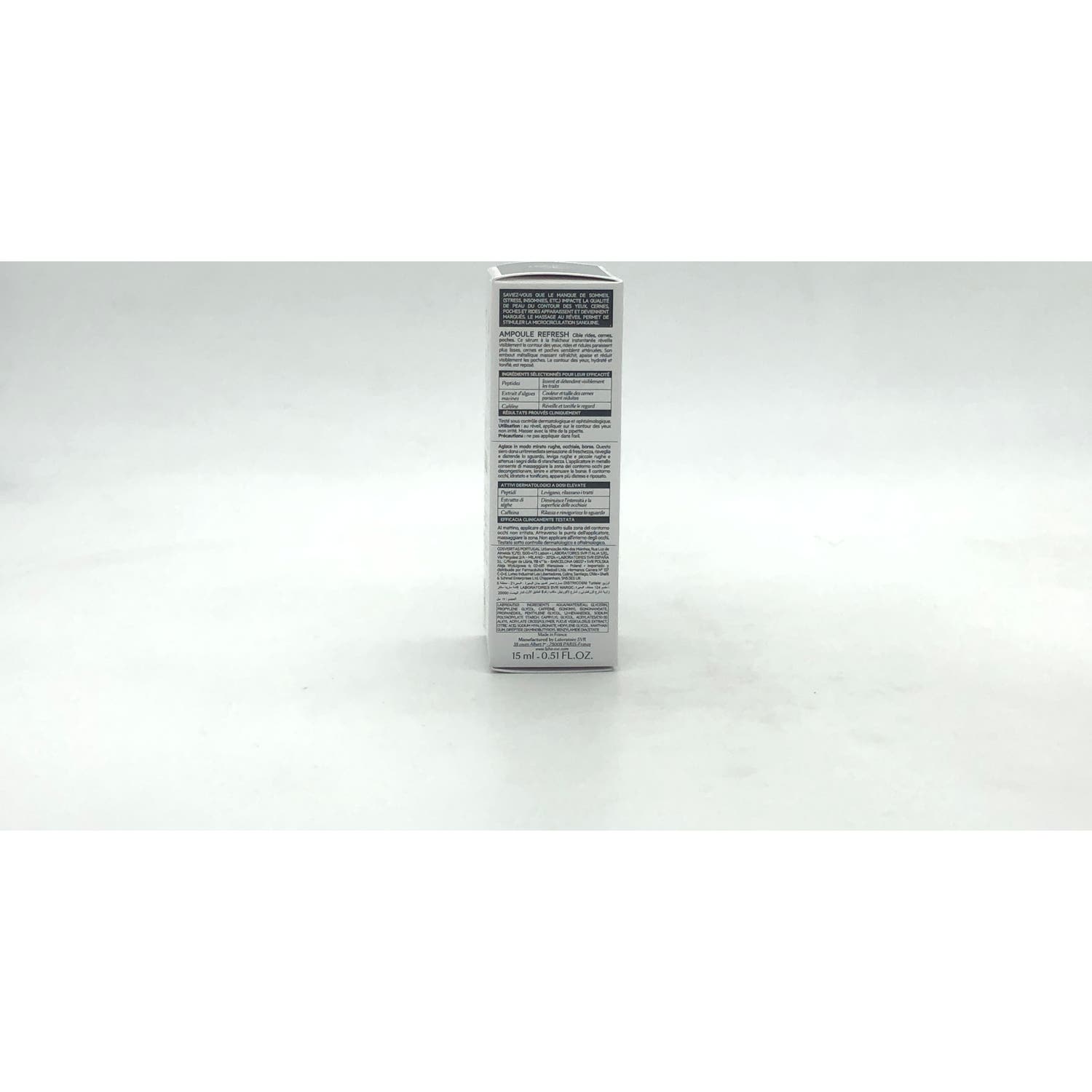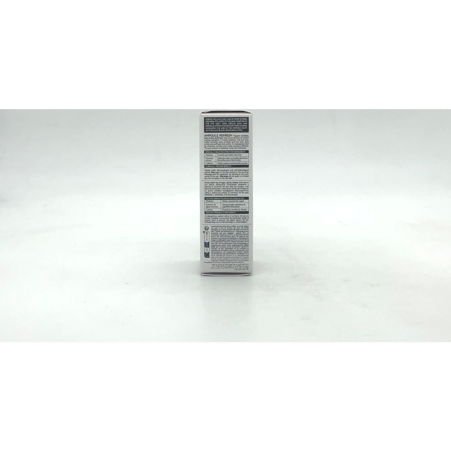 Es un sérum de día ultra-fresco que despierta, tonifica y suaviza el contorno de los ojos. Enriquecido con cafeína, estimula la piel del contorno de ojos, favorece la microcirculación y descongestiona la piel para actuar en las ojeras y bolsas de debajo de los ojos. Formulado con péptidos y ácido hialurónico, el área ocular se alisa, reafirma e hidrata, lista para todo el día.