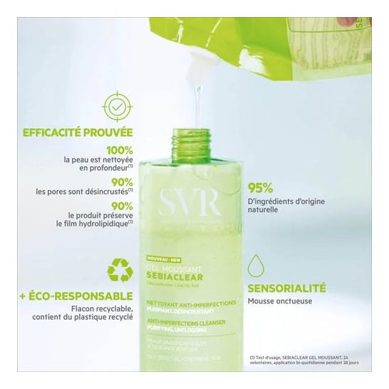SVR Sebiaclear Gel Moussant Dosificador + Recarga es un gel limpiador purificante y desmaquillante formulado sin jabón e indicado para pieles grasas y sensibles. Asimismo, su espuma cremosa ayuda a limpiar y purificar la piel sin resecarla, eliminando las impurezas y el exceso de sebo, desobstruyendo los poros. Para un cutis fresco e hidratado. El set contiene el Gel Moussant dosificador de 400ml y la recarga de 400ml en envase Eco.
